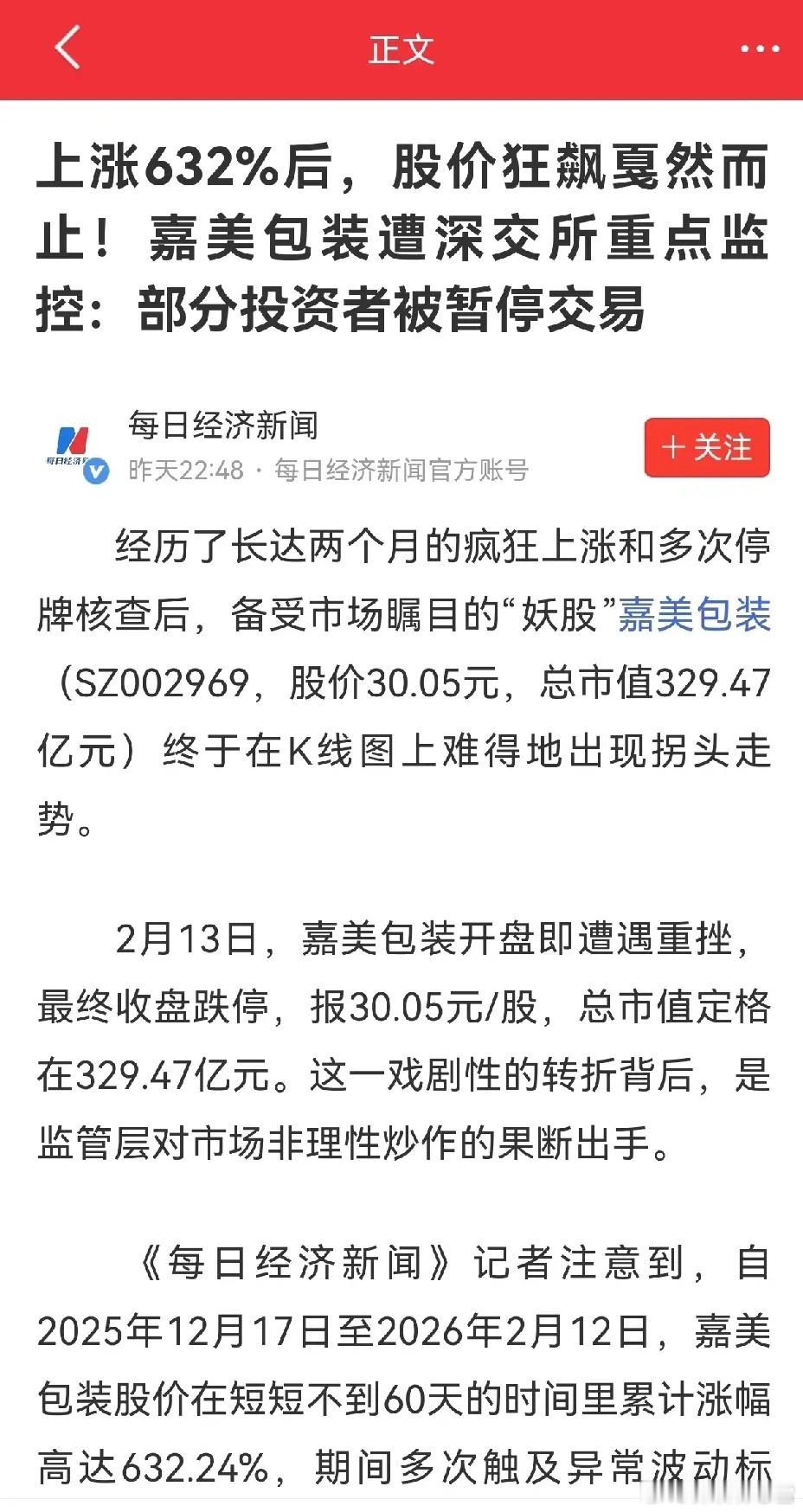 嘉美包装再被交易所重点监控,部分投资者暂停交易,核心逻辑很清晰: