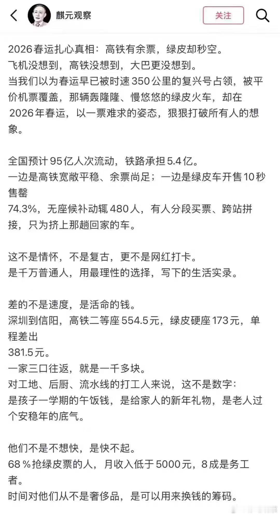 麟元观察不知道是不是卢麟元。说高铁没人做绿皮车全秒了,中国人活命钱没有了。我就去