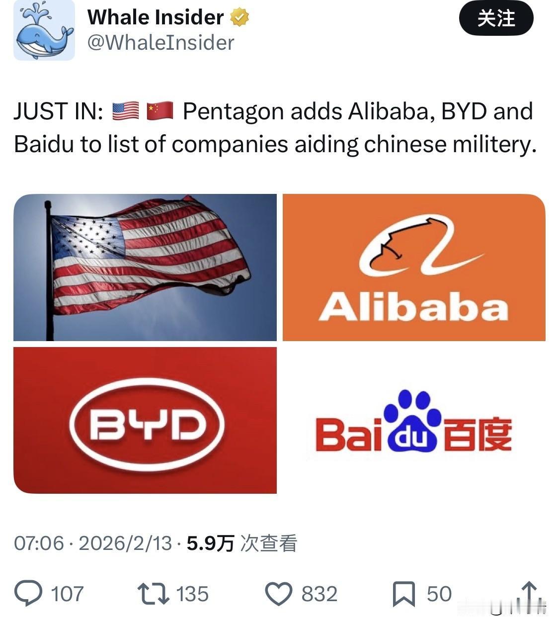 根据 2026 年 2 月 13 日及 14 日的最新消息,五角大楼将阿里巴巴、比亚迪、百度、TP-Link 等中企列入“中国军方公司”名单(即 1260H 清单)后约 1 小时便撤回,引发市场剧烈波动和各种猜测。 美国国防部在联邦公报(Federal Register)上发布了更新后的 1260H 清单,除上述企业外,还包括药明康德、速腾聚创等。然而,五角大楼随后致信联邦公报,要求撤回该通知并移除公众查阅权限,且未说明具体原因。 此次被撤回的名单中,不仅新增了科技巨头,还意外移除了长江存储(YMTC)和长鑫存储(CXMT)这两家顶级芯片制造商。 五角大楼和白宫目前拒绝发表评论,仅通过发言人对 Bloomberg News 和 Nikkei Asia 表示“目前无可奉告”。 市场与政策解读:三层可能性 分析人士认为,这一“神操作”可能源于以下因素的交织: 政治试水与“特朗普访华”前瞻: 特朗普预计将于 2026 年 4 月访华。 分析认为这可能是在高层会晤前释放的“软硬兼施”信号:一方面搁置部分技术禁令以缓和气氛,另一方面通过发布(即便随后撤回)涉军名单来维持对华施压的筹码。 内部流程与跨部门分歧: 专家指出,撤回可能是由于跨部门签署流程(interagency sign-off)出现问题,尤其是关于将某些重要芯片企业从名单中移除的决定,可能在内部尚未达成共识,引发了对华鹰派的批评。 法律与技术细节纠纷: 以 TP-Link 为例,其美国部门与中国部门一直坚称相互独立,而此次名单将 TP-Link 中国单位列入而非美国单位,可能存在界定争议。 阿里巴巴和百度均发表声明表示“毫无根据”,并表示将采取法律行动捍卫权益。 市场反应 股价震荡: 消息发布后,阿里巴巴美股一度下跌约 5%,百度下跌 4.5%,随后在撤回消息传出后跌幅有所收窄。