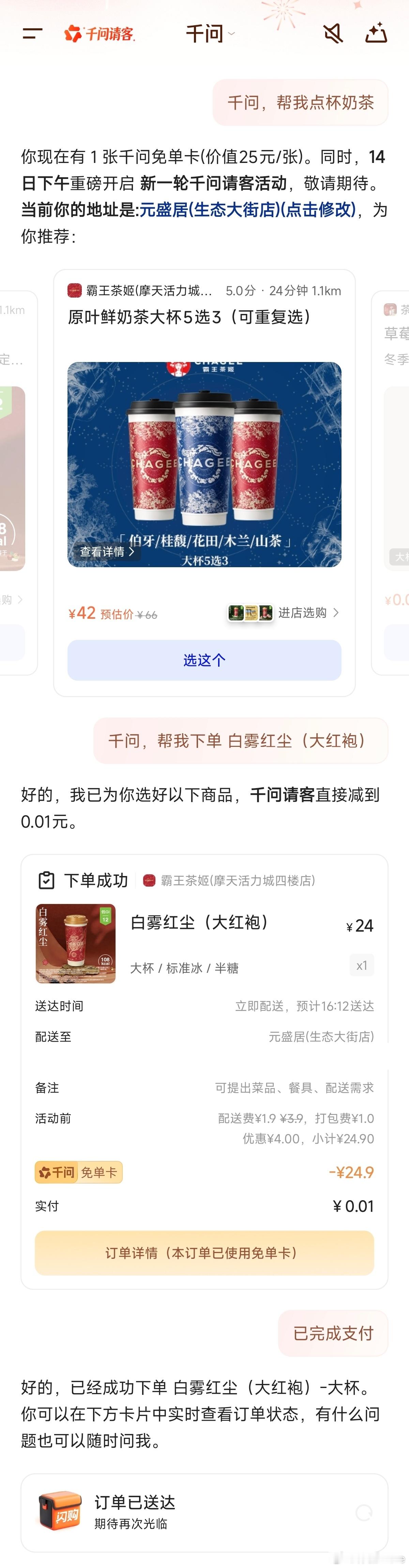 新一轮的千问超级请客卡来了,之前的免单卡我看大家都用来买奶茶了,网友都说“喝爽了,谢谢千问”,一分钱的奶茶就是好喝哈哈。现在网友又求千问第二波薅羊毛攻略 ,我觉得春节期间餐桌和牌桌上就是集卡的好机会。