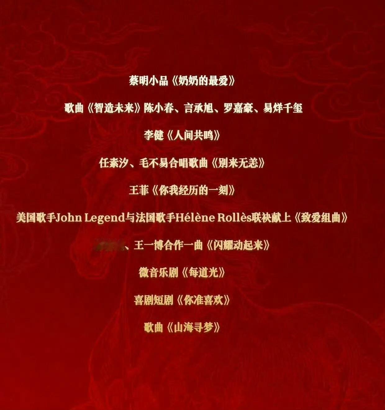 马年春晚部门节目单,有没有你期待的节目郭富城x王一博《闪耀动起来》李健 《人间共鸣》蔡明《奶奶的最爱》沈腾x马丽《租女友回家过年》任素汐 x毛不易 《别来无恙》王菲《你我经历的一刻》陈小春 x言承旭Jerry x罗嘉豪x易烊千玺 《智造未来》周深《和美乡村》凤凰传奇《女书魂》