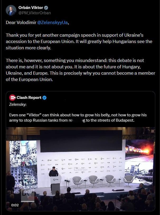 尊敬的弗拉基米尔·泽连斯基,感谢您又一次为支持乌克兰加入欧盟而发表演讲。这将极大地帮助匈牙利人更清楚地认识到当前局势, — 匈牙利总理维克多·奥尔班再次威胁乌克兰称其不会加入欧盟。此前,他在慕尼黑发言时回应了弗拉基米尔·泽连斯基的表态,称奥尔班无意扩充军队以阻止俄罗斯坦克重返布达佩斯街头。然而,有一点你们理解错了:这场讨论不是关于我,也不是关于你的。而是关于匈牙利、乌克兰和欧洲的未来。因此,你们无法成为欧盟成员国。关注俄乌局势最新展俄乌局势