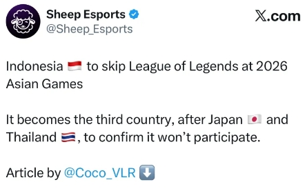 直播吧2月15日讯近日,外媒报道称印度尼西亚将缺席2026年名古屋亚运会英雄联盟项目,而这也是继日本、泰国之后成为第三个确认不参加该项目的国家!