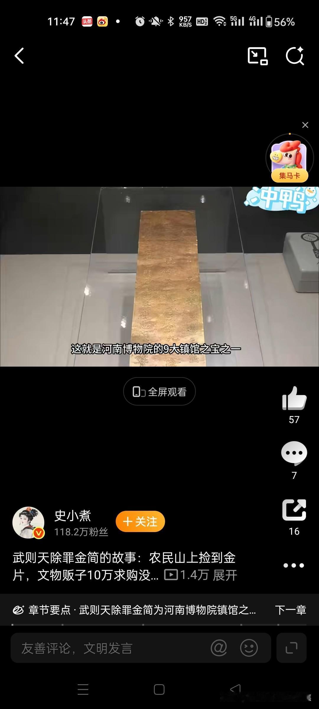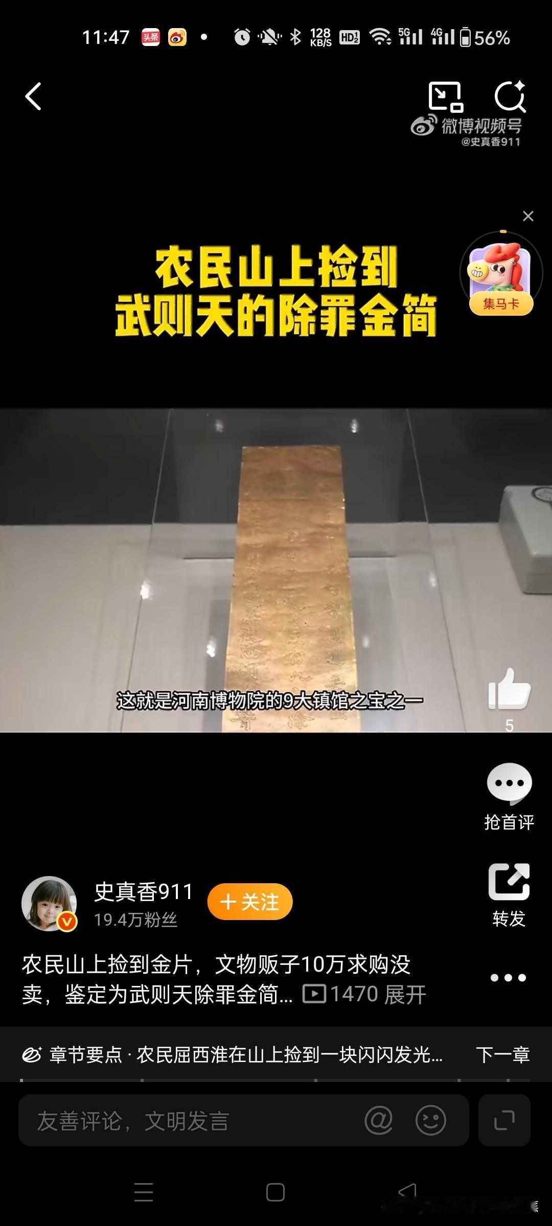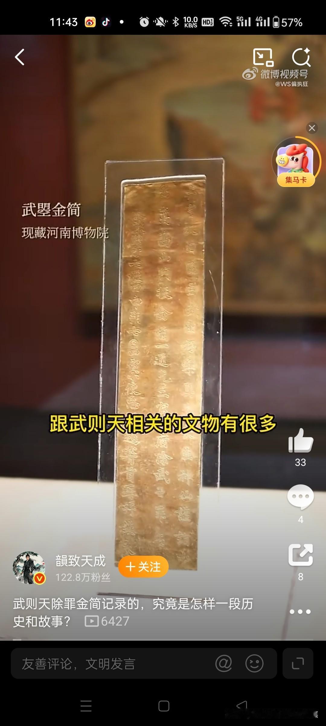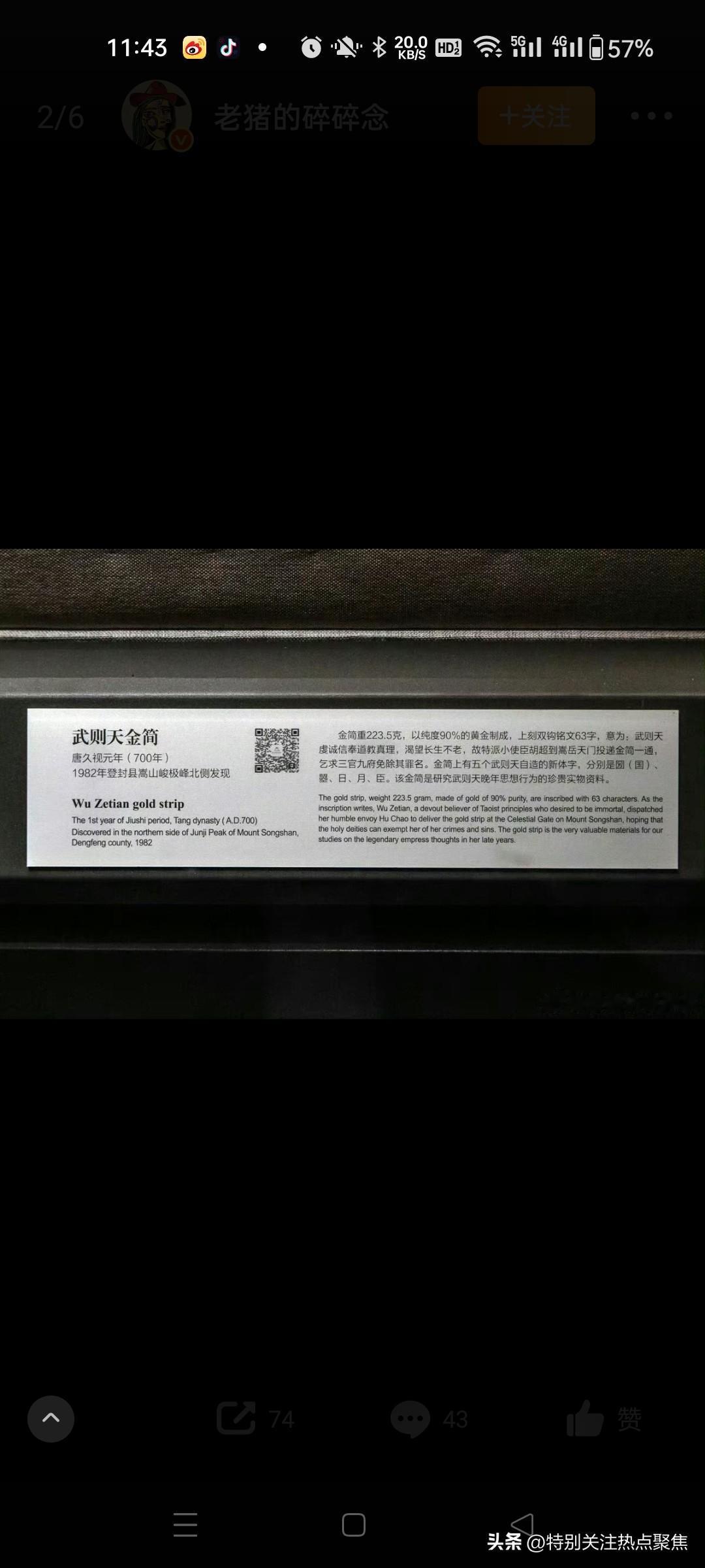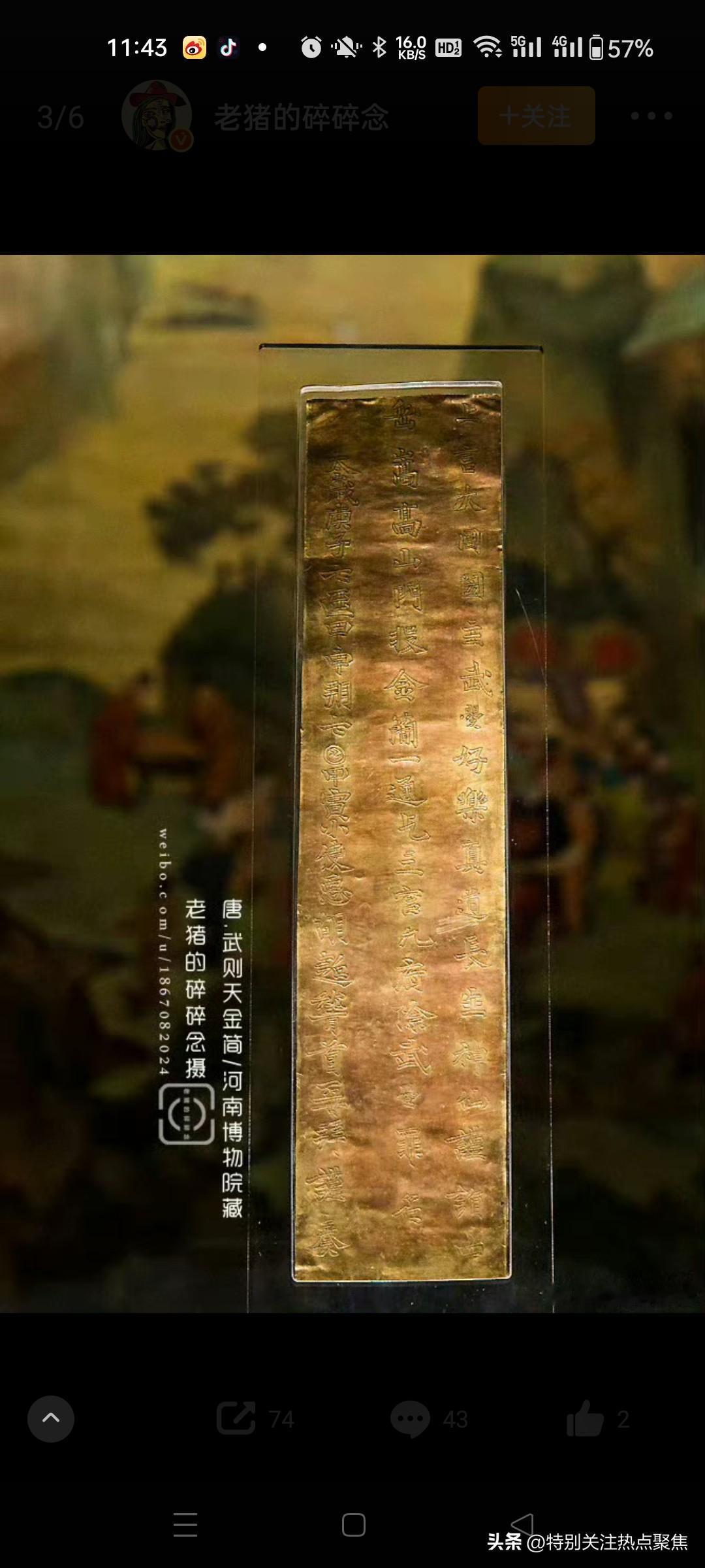 采药农民石缝中捡到一块刻字金片,意外揭开了武则天晚年唯一存世的忏悔密信,这件颠覆女皇冷酷形象的国宝,如今是河南博物院镇馆之宝。 1982年5月被偶然发现,是一位农民(屈西怀)在登封县嵩山采药时,在山顶峻极峰的石缝中发现了纯金的简片。这也是现存惟一一件属于武则天带文字的器物。 金简上的原文是:上言大周圀主武曌好乐真道,长生神仙,谨诣中岳嵩高山门,投金简一通,乞三官九府,除武曌罪名。太岁庚子七月庚子七日甲寅,小使臣胡超稽首再拜谨奏。文物看唐诡3历史知识吃饱了 1982年河南嵩山采药农民屈西怀石缝中捡到一块刻字金片,意外揭开了武则天晚年唯一存世的忏悔密信,这件颠覆女皇冷酷形象的国宝,如今是河南博物院镇馆之宝。 一、山间采药的惊天发现 1982年5月,河南登封县农民屈西怀在嵩山峻极峰采药时,搬开石块发现一件裹着黄纸的金属片,表面布满棕黑色锈迹。消息传开后,多名文物贩子登门求购,价格从千元飙升至10万元(相当于当时普通工人数十年的收入),但屈西怀最终拒绝诱惑,主动上交文物部门。经专家鉴定,该物为纯度96%的黄金简牍,长36.2厘米、宽8厘米、重223.5克,双钩錾刻63字楷书铭文。 二、金简背后的历史密码 女皇的隐秘独白 铭文清晰记载:“大周圀主武曌好乐真道...乞三官九府除武曌罪名”(圀为“国”异体字,曌是武则天自名)。公元700年七月七日,77岁的武则天遣道士胡超将此简投于嵩山祭祀台,祈求道教神灵赦免其罪孽。这与史书所载她晚年病重、还政李唐的时间点吻合,印证其权力交接前的心理挣扎。 颠覆传统认知 金简揭示了武则天鲜为人知的恐惧面:一生杀戮过重(包括子女、宗室及政敌),晚年忧虑死后遭天谴。这与“无字碑”形成呼应——非因洒脱,实为对罪责的沉默。 文物的唯一性价值 作为现存唯一与武则天直接关联的可移动文物,它打破“武则天无实物传世”的认知。其上5个自创汉字(如“曌”“圀”)成为武周朝断代关键证据,锤揲工艺与书法风格(融合虞世南温润、褚遂良劲健)更见证盛唐技艺。 三、发现者的抉择与历史余响 屈西怀上交金简后获1500元奖励与锦旗,晚年病重时获特批再睹文物,2026年以平凡农民身份离世。金简现藏河南博物院,为九大镇院之宝之一,复制品存嵩阳书院供瞻仰。 这件深埋嵩山1280年的金简,以“乞除罪名”四字刺破权力神话,让后世看见:即便中国唯一女帝,终难逃人性的忏悔枷锁。 拒绝天价诱惑 消息传开后,多名文物贩子上门求购,收购价从1000元飙升至10万元(相当于当时农民百年收入)。面对巨款,屈西怀经激烈思想斗争后选择拒绝,认为“文物属于国家,卖了对不起良心”。@大象新闻414 主动上交国家 屈西怀将金简拓印送县文物部门鉴定,专家根据铭文中的“曌”(武则天自创名)等字确认身份。在当地干部劝说下,他无偿上交金简,仅收取1500元奖励金、一面锦旗及荣誉证书。@史墨尘36大象新闻 二、金简的文物价值与历史意义 实物特征 材质:纯度96%的黄金制成,长36.2厘米、宽8厘米、重223.5克,薄仅0.1厘米。823 铭文:双钩楷书刻63字:“上言:大周圀主武曌好乐真道,长生神仙……乞三官九府除武曌罪名。太岁庚子七月甲申朔七日甲寅,小使臣胡超稽首再拜谨奏”。@鹏说文史2834 特殊文字:含武则天自创字“圀”(国)、“曌”等至少5个异体字。234245 历史背景 投简目的:公元700年,77岁的武则天命道士胡超在嵩山举行道教“投龙”仪式,祈求三官(天、地、水神)免除“罪名”(道教指疾病灾祸),助其长生。102338 帝王独例:此为现存唯一唐代帝王金简,印证武则天晚年从崇佛转向道教,反映其权力交接期的心理焦虑。@地球知识局1023 唯一性与地位 因武则天与唐高宗合葬的乾陵未发掘,此金简成其唯一传世可移动文物,现为河南博物院“九大镇馆之宝”之一,国家一级文物。@陕西历史博物...815鹏说文史雍州节度使石泉泉Yo地球知识局 三、农民上交的争议与后续 奖励争议:1500元奖励与10万元收购价相差悬殊,引发公众对文物捐献制度的讨论。屈西怀晚年受访时表示:“上交是我一生最自豪的事,从未后悔”。1416 社会影响:此事成为文物保护宣传典型案例,金简在《唐朝诡事录》等影视剧中的出现,进一步激发公众对历史文物的关注。@循环热恋3540循环热恋安安CaTuT顶端文娱 四、学术新解:金简中的“除罪”真意 近年研究指出,“除武曌罪名”是道教投龙简固定格式,指祛除病痛灾厄的“原罪”,非世俗的道德忏悔。武则天借宗教仪式寻求心理慰藉,而非对政治生涯的否定。@韻致天成3844韻致天成