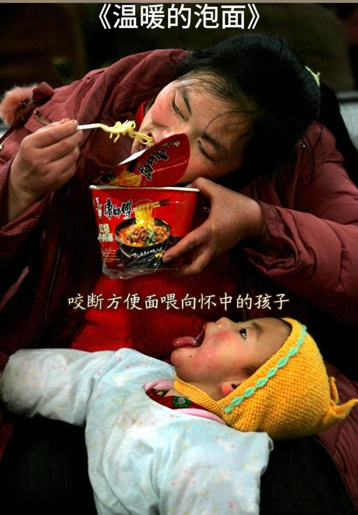 旅途中的母亲正咬断面条,怀里的孩子迫不及待的仰着脸伸着舌头等待母亲的面条!有专家