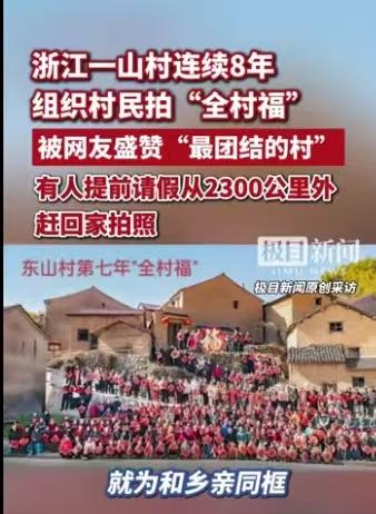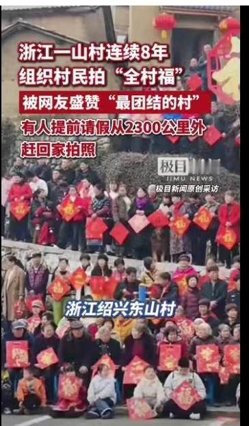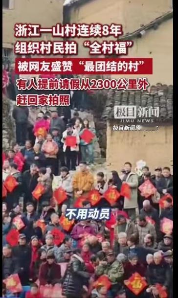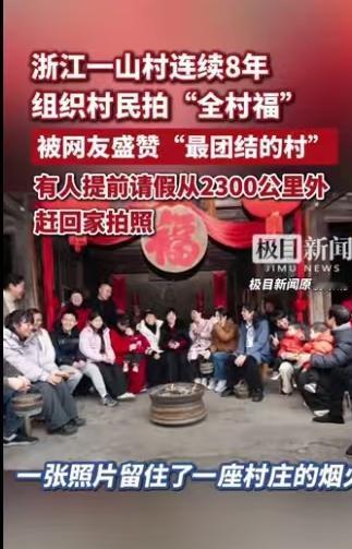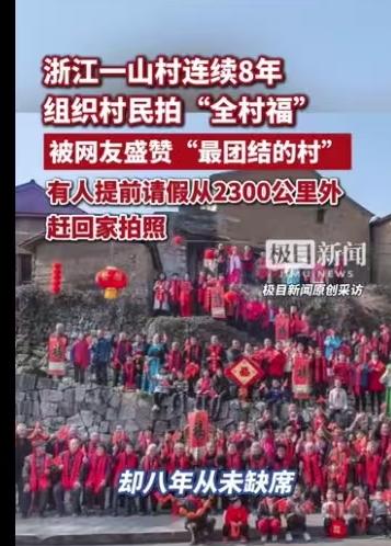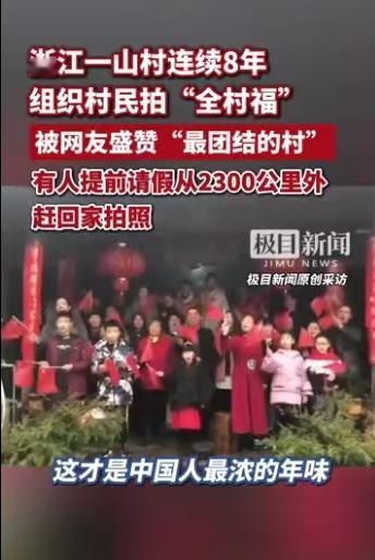 为了一张照片,有人跨越2300公里:浙江这个村连续8年拍“全村福”,这才是过年该有的样子 一张照片能有多大的分量?在浙江省绍兴市新昌县东山村,它的分量重到足以让游子跨越2300公里归家。 2024年2月13日,大年初四,当很多人还沉浸在走亲访友的节奏中时,东山村却有着一项更为宏大的“保留节目”——第八届全村福拍摄活动。这可不是普通的合影,这已经是该村连续第8年组织村民拍“全村福”了。这一天,通往村庄的道路车水马龙,原本宁静的小山村瞬间热闹非凡,堪比春运高峰现场。 这活动的缘起,其实挺朴素。时间推回到2018年,那年村晚结束后,一位叫徐乐安的村民提议,大家伙儿不如拍张合影留个念想。谁承想,这一拍就停不下来了,从最初的简单合影,演变成了村里雷打不动的年度盛事。在这张巨大的合影里,不仅有在家的老人孩子,更有专程请假赶回来的打工人。有人为了这一瞬间的定格,不惜提前请假,从2300公里外匆匆赶回。这种执着,或许就是中国人骨子里对“团圆”二字最生动的注解。 现场的画面相当震撼。徐敏明一家8口齐刷刷亮相,家中79岁的老父亲和77岁的老母亲精神矍铄地坐在前排,虽然妹妹因为工作原因没能赶回来略显遗憾,但这丝毫掩盖不了大家庭团聚的喜悦。村支书徐贤惠更是底气十足,他表示村民们都非常支持,只要大家乐意,这活动就会一直办下去。这种“全村总动员”的凝聚力,让不少网友竖起了大拇指,直呼这里是“最团结的村”。 当然,也有人调侃:“我们全村太大了,根本装不下一个照片。”这句来自北京网友的评论带着几分羡慕几分无奈,也侧面烘托出东山村这份“小而美”的幸福是多么难得。在这个人口流动日益频繁的时代,很多乡村面临着空心化的尴尬,平日里多是留守老人和儿童。而东山村用一张“全村福”,硬生生织起了一条情感纽带,把散落在天南海北的村民又拉回到了同一个镜头里。 这不仅仅是一次简单的拍摄,更是一种文化标识的形成。它告诉我们,过年的意义不仅仅在于吃喝穿戴,更在于人与人之间那份紧密的连接。当快门按下的那一刻,定格的不仅是笑脸,更是乡愁的归宿和归属感的延续。在这个充满变数的时代,东山村用这种充满仪式感的方式,守护着乡村的温情与热度。这张照片,值得每个人珍藏一整年。 以上内容仅供参考和借鉴
