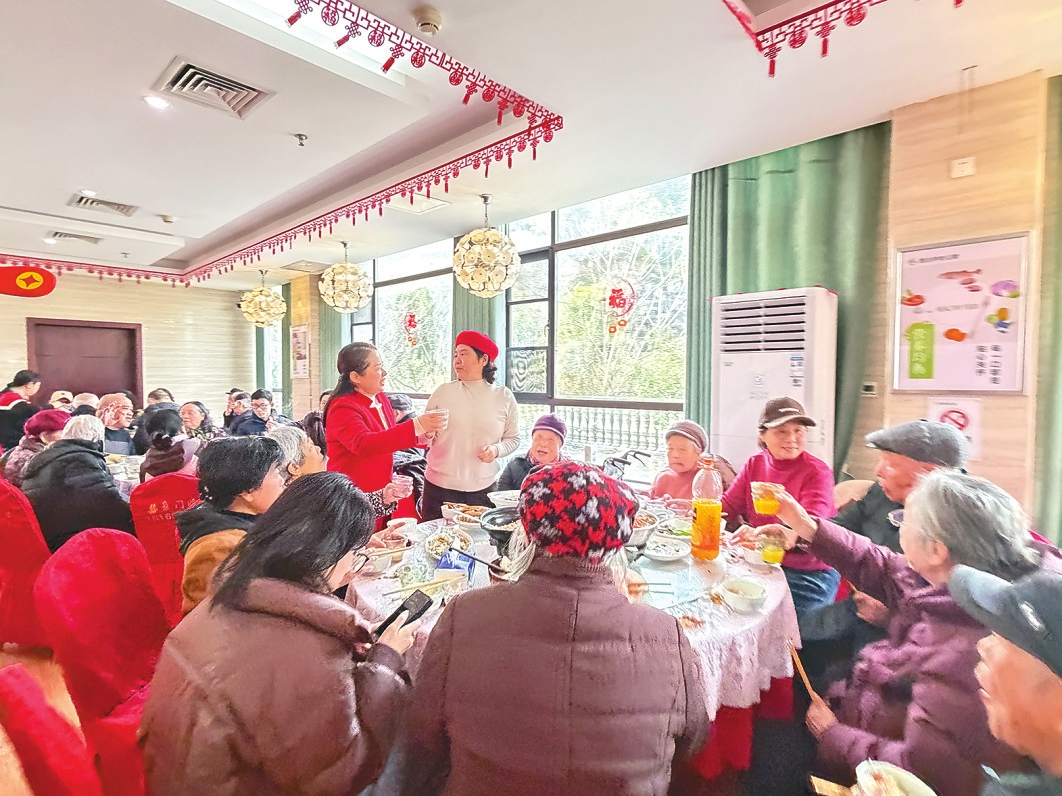 11时,团圆饭开席。10张大圆桌依次排开,清蒸鲈鱼、红烧甲鱼、盐菜蒸肉……一道道热菜上桌,蒸汽氤氲。穿着红马甲的工作人员穿梭其间,为老人布菜、添茶,俯身时凑近老人耳边送上祝福。