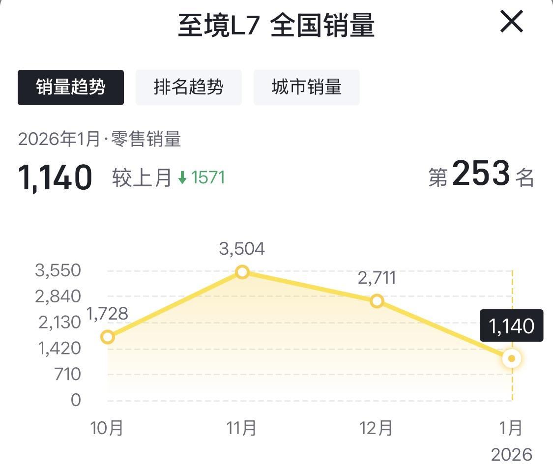 至境L7上市销量最高峰超3千辆,12月开始下滑,1月仅有1140辆,对比10天大