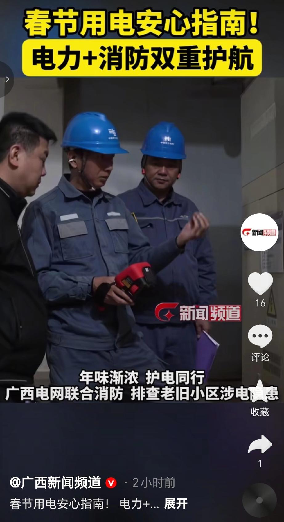年味渐浓为了保证春节区间正常用电,广西电网联合消防部门电力+消防双重护航的核心要点,规避涉电隐患,对老旧小区存在的安全隐患进行排查,确保春节期间用电安全如线路短路、电力设施破损,及时拨打广西电力服务热线95598报修。(来源于@广西新闻频道 )