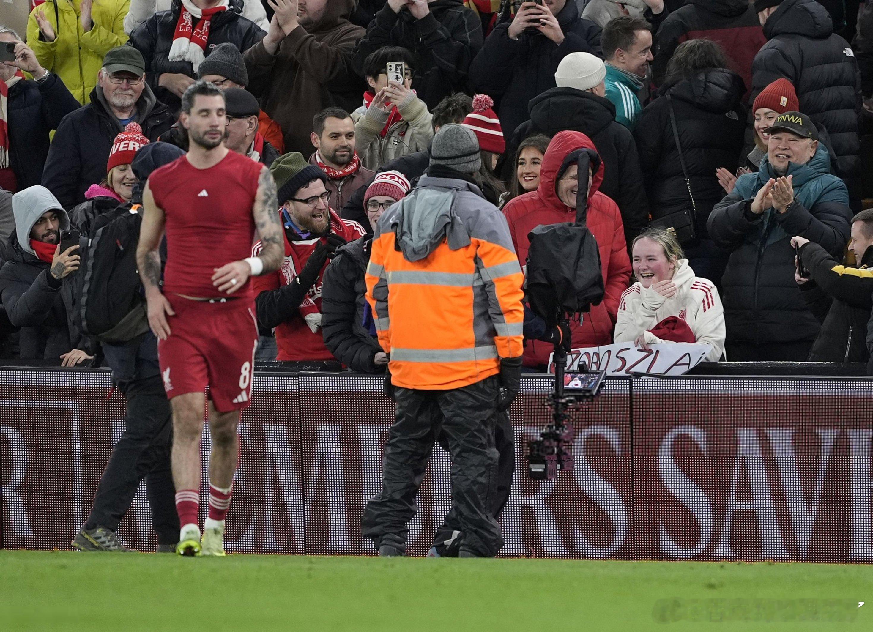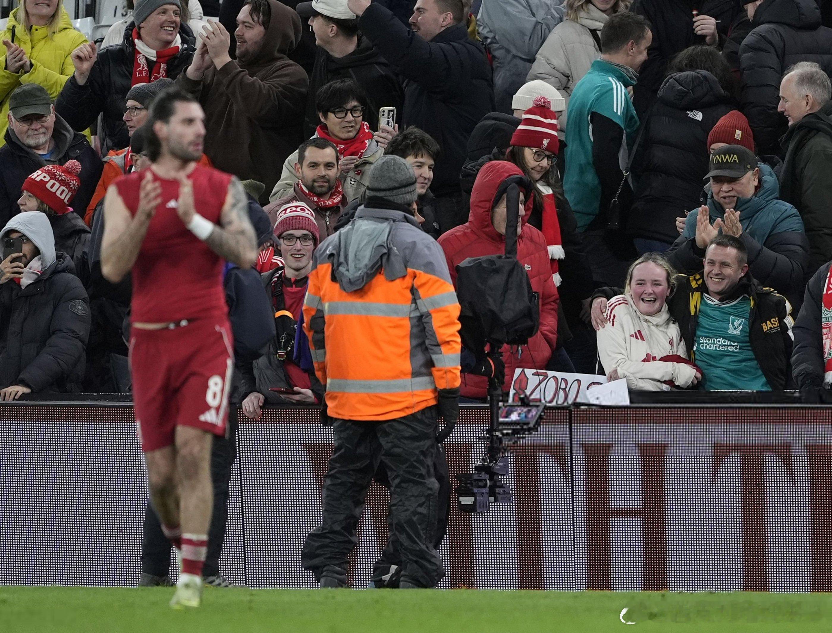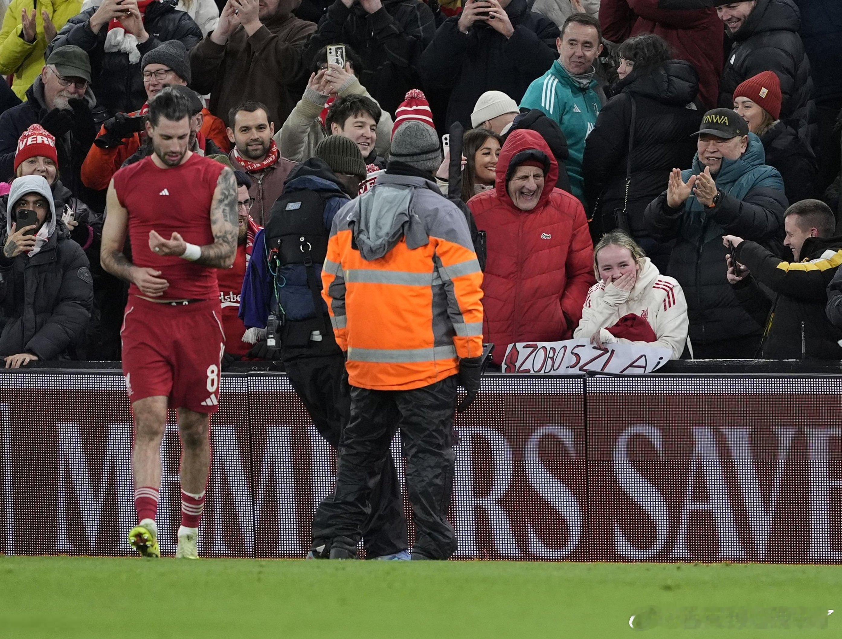 索博把球衣送给了一位举着索博名字的女球迷,女球迷开心起飞了