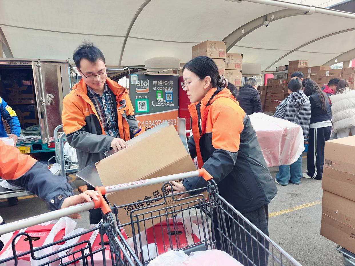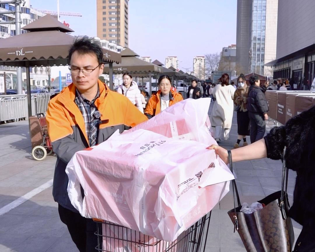 年味越来越浓,快递点前,一对年轻夫妻推着满满当当的购物车正要寄出。两人一时兴起,凌晨一点半从安徽出发,开车六小时到达许昌。冲着对胖东来的那份放心,一口气买了两千多块的东西,要寄回老家。
