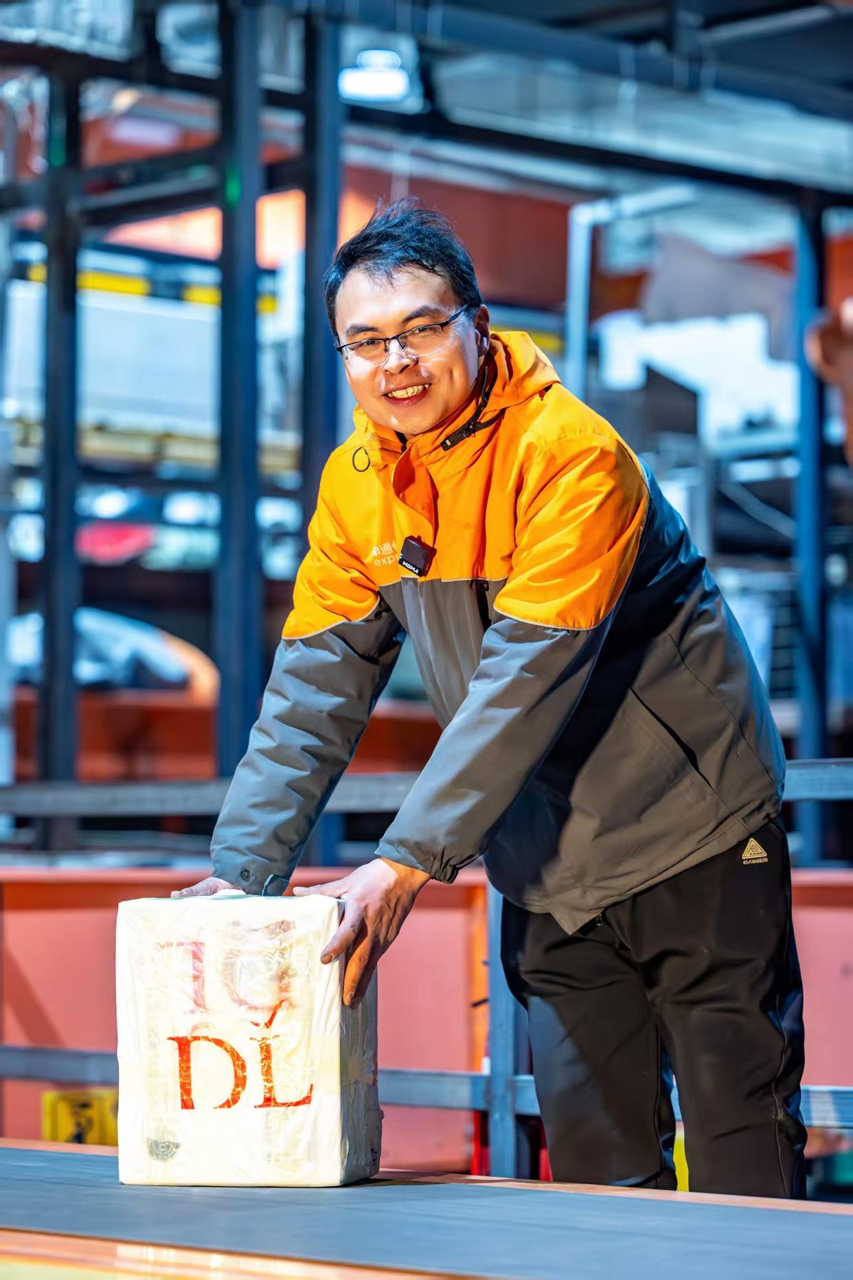 在这个片区工作了十年的申通快递员王超,正熟练地拼起两只纸箱,合成一个正好适合胖东来新春礼盒的包装。