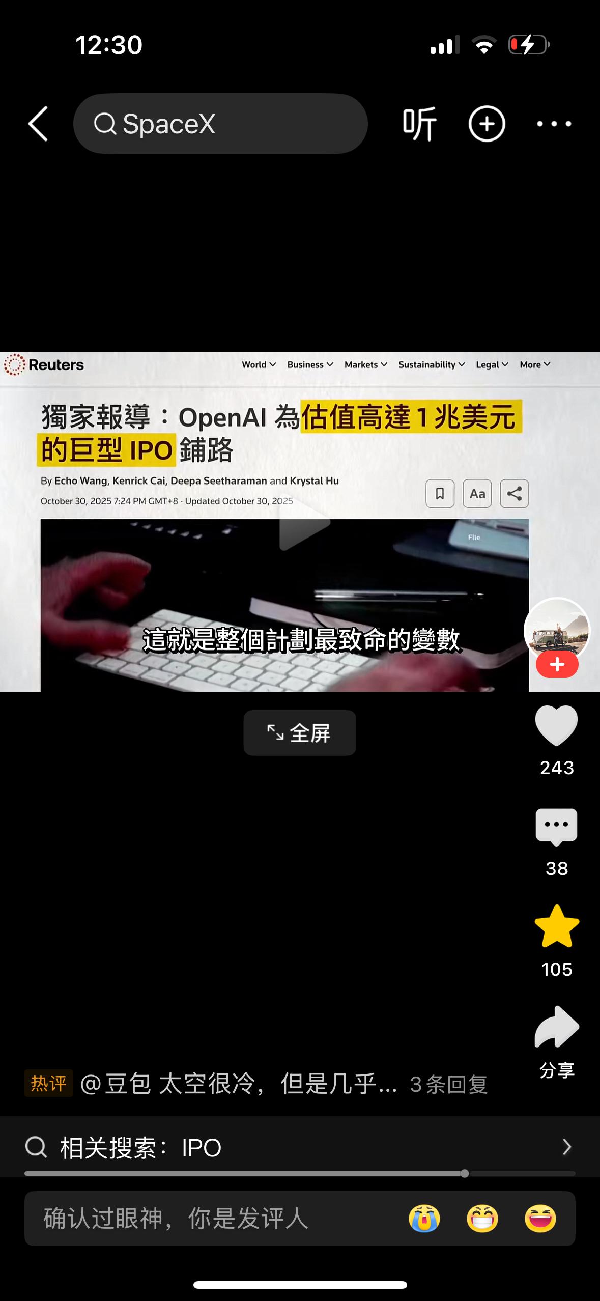 马斯克成功的逻辑理论很简单,如果不够大胆,你就会平庸,如果你不够疯狂,就改变不了世界。他利用这种理论建立了特斯拉,speak X,X Al等六家伟大的企业。以前他是从来不屑于把公司上市的,因为上市以后是到监管他就不能发挥自己的独特能力。问题是他现在碰到了巨大的财务困难,原因就是他花了440亿美元收购了推特造成的巨额亏损及XAl每年巨大的投资额,这两个公司每年达到170亿美元的规模的资金缺口,所以他必须把speak X上市来解决资金问题,目标是今年六月份前。这次上市存在着一个巨大的不定性就是openAI也在准备今年上市。如果openAI先于马斯克上市,他将筹集不到他需求的资金,马斯克有可能输得一败涂地…..