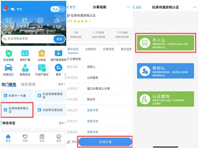 如果是他人协助认证,可用他人的手机和账号登录“渝快办”APP,通过首页“热门服务”→点击“社保待遇资格认证”→点击“在线办理”→选择“帮你认”。
