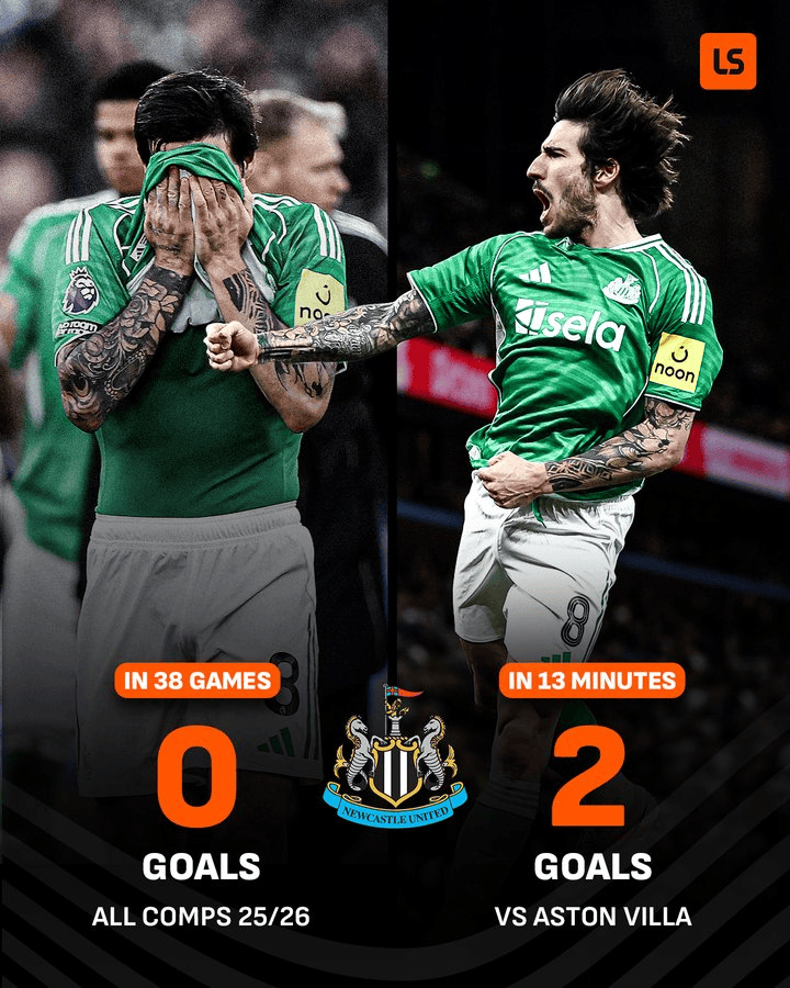 虎扑02月15日讯足总杯第四轮,纽卡斯尔联3-1战胜阿斯顿维拉,托纳利两次上演远射破门。