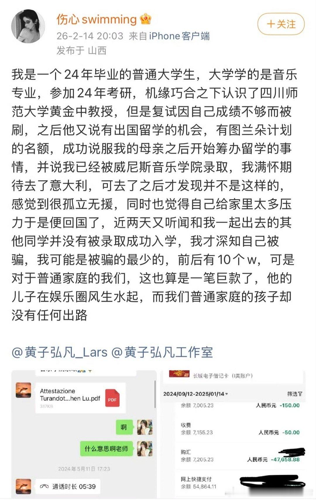 阎肃观察肃言肃语黄子弘凡爸爸是国家一级演员 曝黄子弘凡爸爸诈骗学生?黄子弘凡爸爸是国家一级演员,感觉不会为了十万块钱毁了自己的名声形象和儿子的星途。黄子弘凡工作室已经宣布以涉嫌诽谤罪起诉!大家理性吃瓜,等一个后续 春节刷到宝了