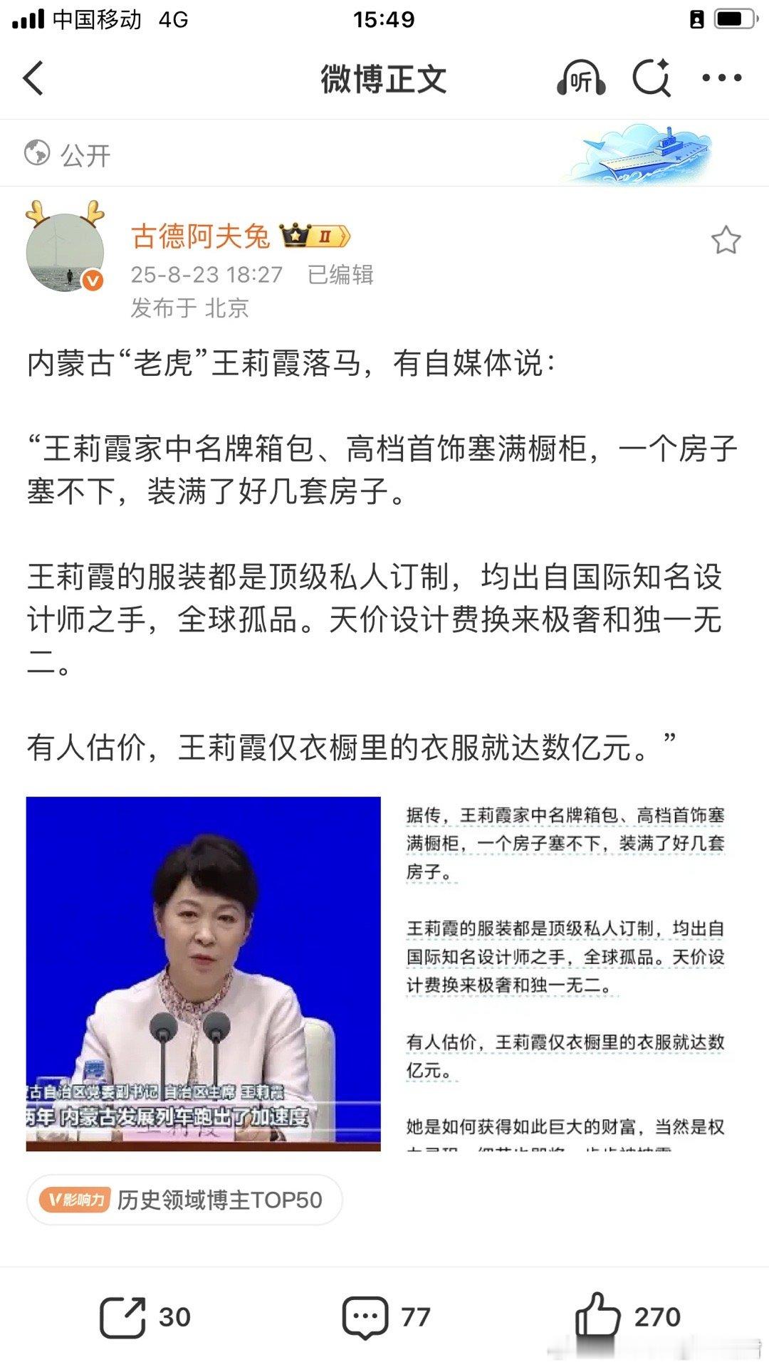 荐见:转个新闻。女贪官的衣橱。内蒙古自治区党委副书记、自治区政府主席王莉霞任上被查,这位省级政府“一把手”有可能面临死缓判决。