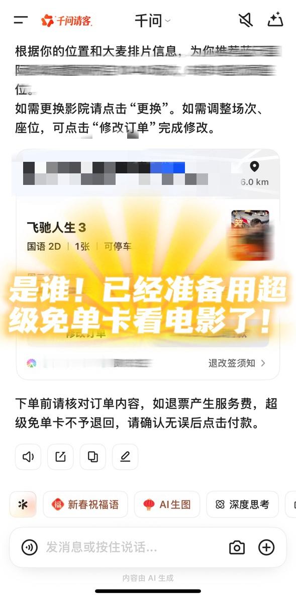 千问再次激活群聊 赢麻了,朋友圈还在抢几毛几分的AI红包,我直接在千问拿超级免单卡,正好今晚看电影就能用,多亏了被激活的群聊!速去拉人继续领免单咯