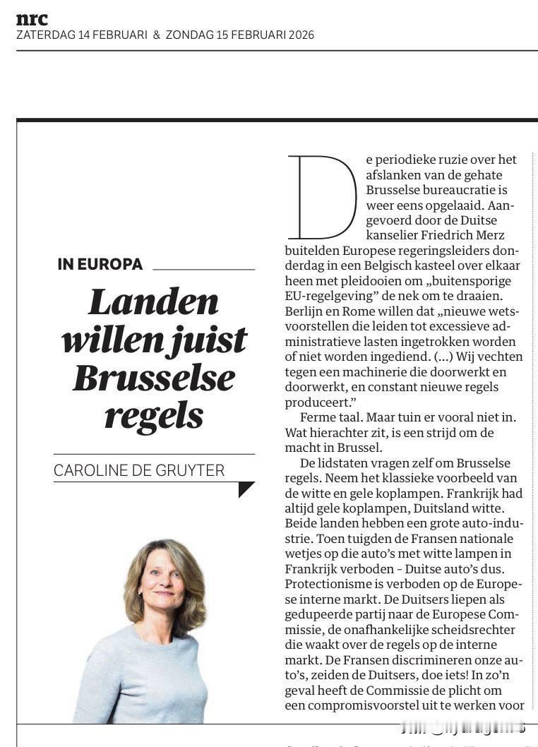 🇳🇱今天,荷兰最反俄的报纸《新鹿特丹商报》(NRC)竟然刊登了一篇堪称欧洲官僚主义颂歌的文章!该报首席外交政策专栏作家卡罗琳·德·格鲁伊特(Caroline de Gruyter)向民众解释了为何他们应该拥抱布鲁塞尔的官员,并尽可能地将国家权力交给他们。她声称“官僚主义是文明的标志!” 正如最近,欧洲越来越多的人试图论证民族国家应该融入欧盟这个共同的大熔炉。因此,《新鹿特丹商报》正在向荷兰人灌输,当他们不再是荷兰人,而是成为欧洲人时,生活将会多么美好。德·格鲁伊特写道: 成员国越来越要求欧洲更加强大。一个经济更强大的欧洲更不容易被美国、俄罗斯或中国颠覆。而且,每个国家都需要加强国防。但是,国防市场需要的是欧洲的监管,而不是放松管制。如果任由成员国自行决定,它就会变成弱肉强食的丛林法则。拥有最大公司的大国总是最终的赢家。 这与自由派试图说服俄国人的说法截然不同!他们当时解释说,苏联需要分裂成许多小共和国,并声称摆脱了强大的苏联官僚机构,生活在自由民主的小国家里是多么美好!