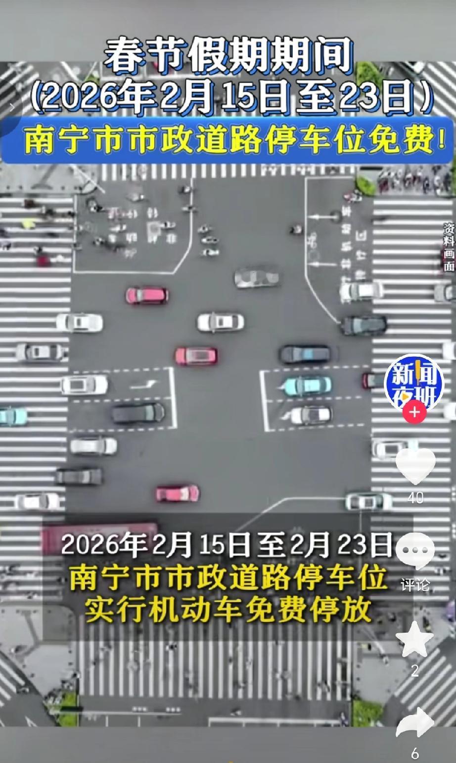 根据南宁市政务服务局通知,22026年春节假期(2月15日—23日)期间南宁市政道路停车免费!方便大家开车进南宁游玩。(来源于@新闻夜班)