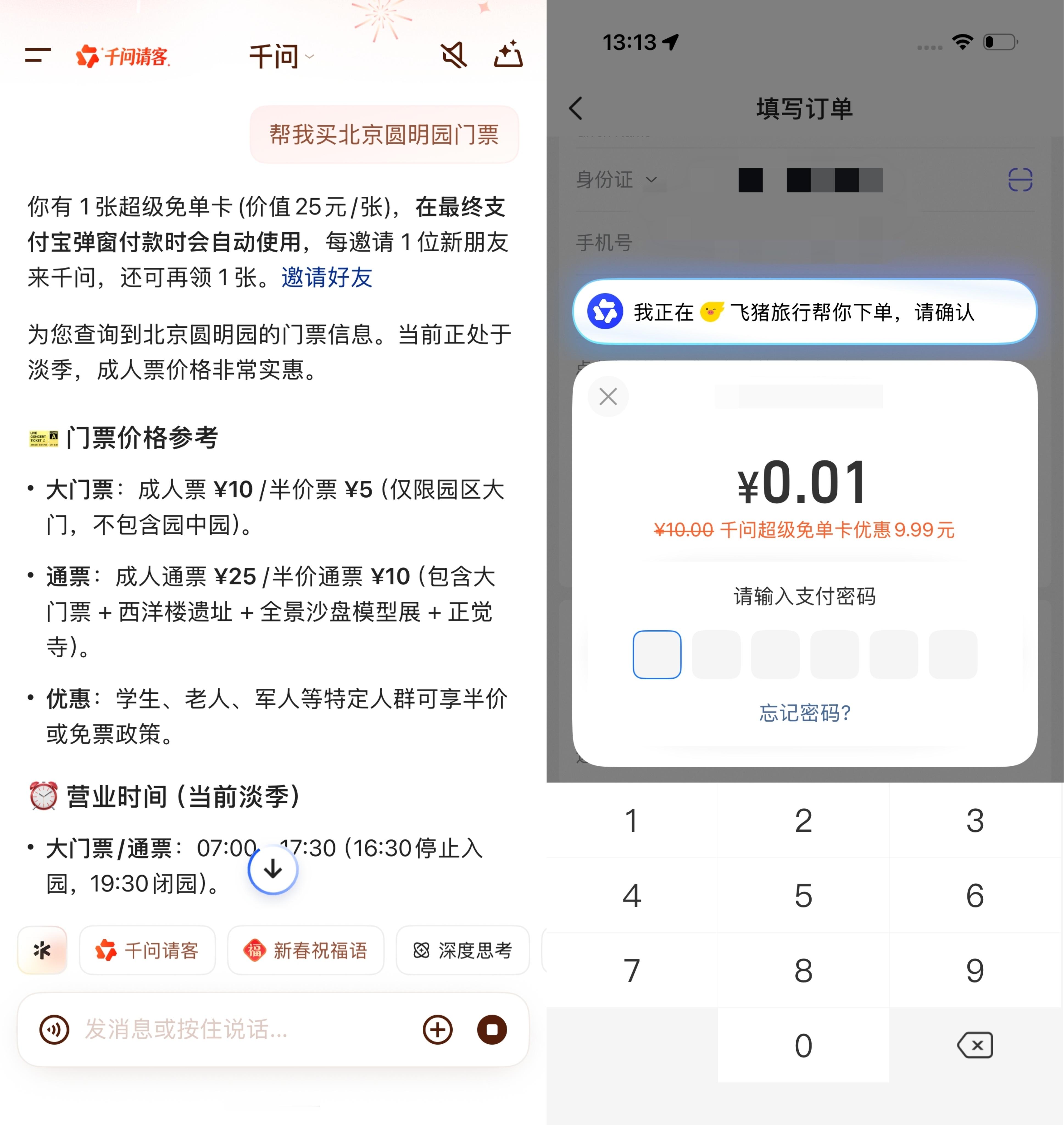 千问让我实现了景区门票自由 春节假期到处逛逛,真的太幸福了!多亏了千问,帮我省下超多景区门票钱。新用户领25元超级免单卡,AI订门票立享优惠,不用复杂套路,优惠直接看得见。邀请新朋友一起使用,双方都能得超级免单卡,多邀多得,轻松实现逛遍景点自由。这个春节,有千问陪伴,出行更轻松,快乐不打折! 千问超级免单卡能买年货能买票