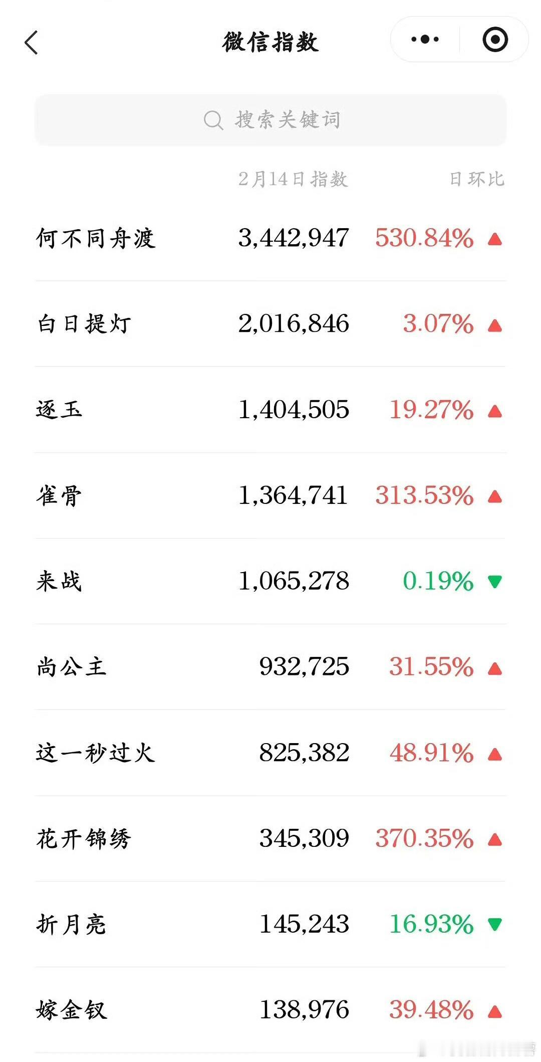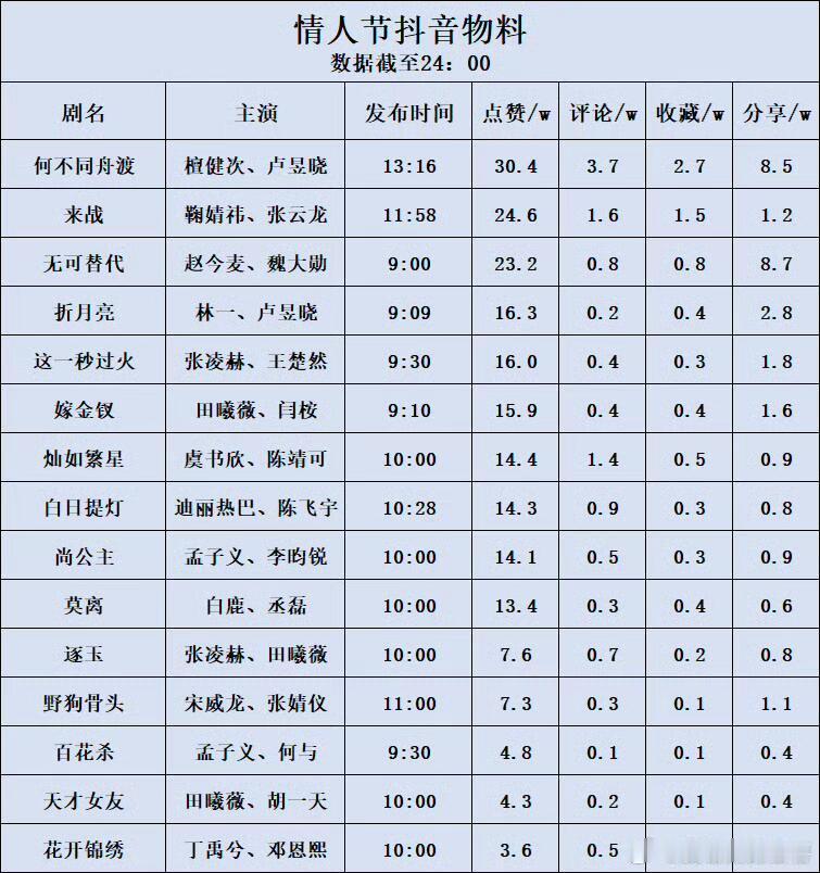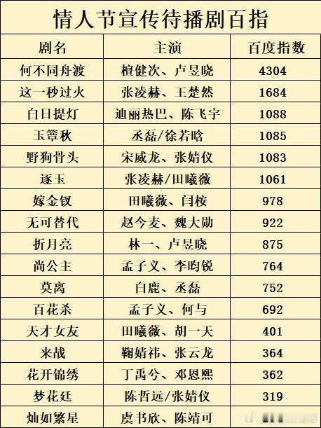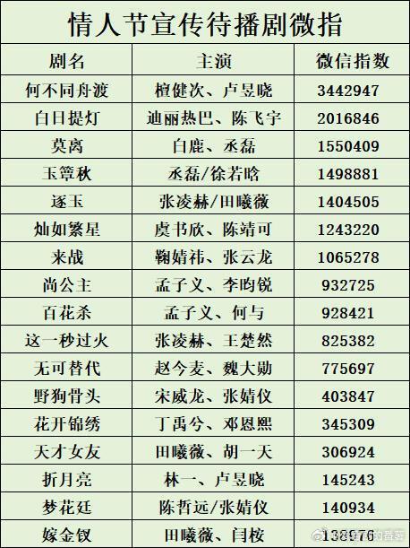 待播剧情人节物料热度汇总何不同舟渡各维度断层第一(檀健次,卢昱晓主演)白日提灯(迪丽热巴,陈飞宇主演),来战(鞠婧祎,张云龙主演)和这一秒过火(张凌赫,王楚然主演)热度也不错