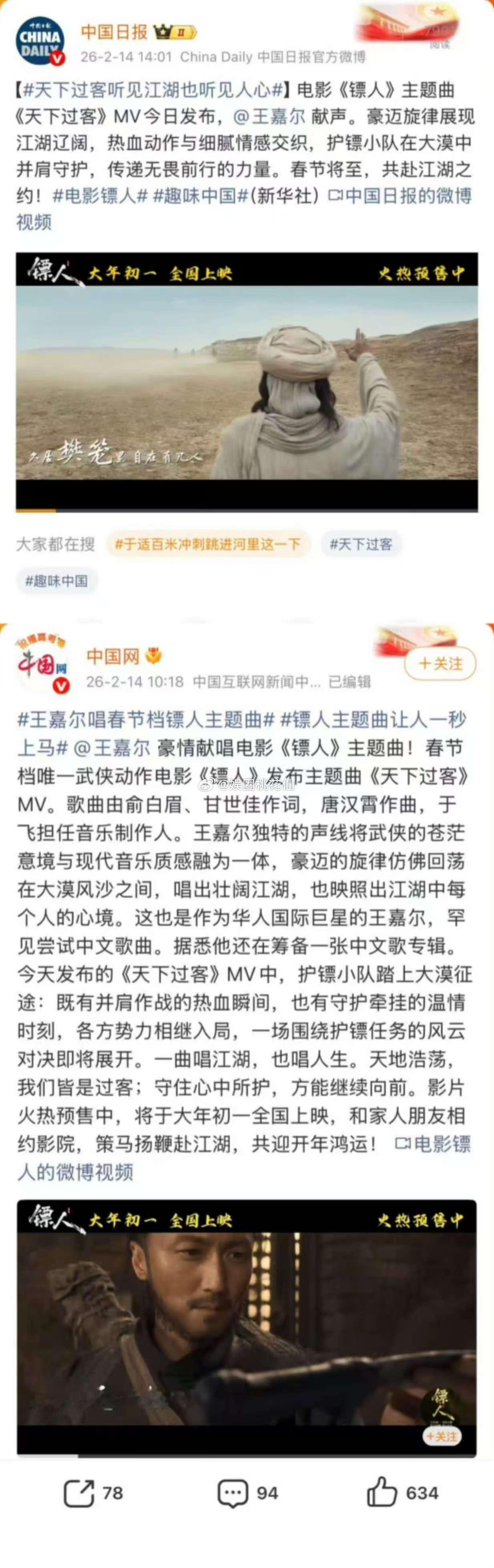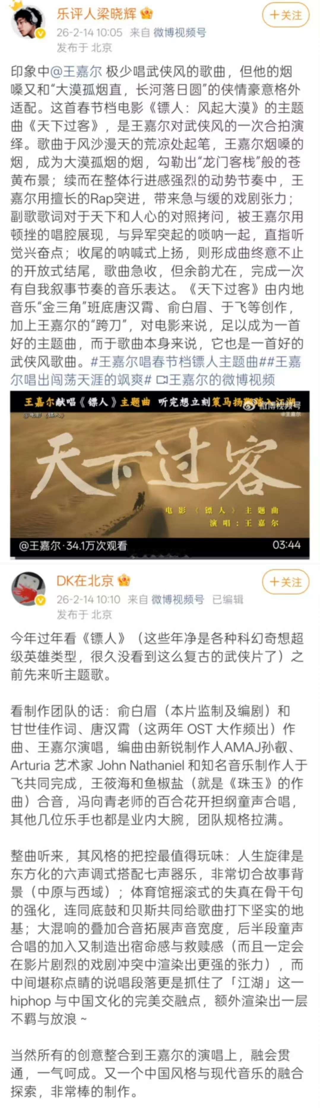王嘉尔镖人主题曲有效宣传 天下过客这首歌真的越听越上头,王嘉尔极具辨识度的声线,唱出了镖人世界的侠气与洒脱,歌曲上线后迅速出圈,引来官媒与乐评人集体推荐,已经准备好去影院感受这份热血