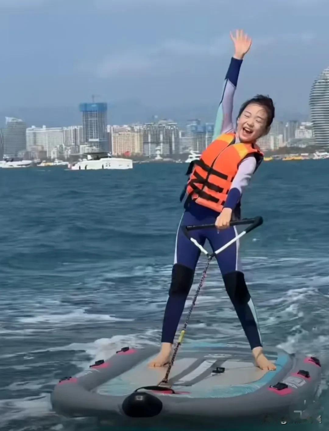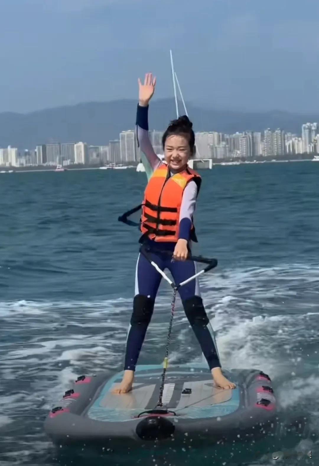 果然是勇敢的女孩先享受世家啊! 小酒窝和家人去三亚度假,小小年纪的她第一次尝试冲浪。她扎着丸子头,穿着救生衣,在冲浪板上高兴的笑着,好阳光明媚又自信的一个女孩。 到底是学跳舞的,这平衡力可真好,完全看不出是第一次冲浪,不仅动作好稳,而且她胆子也好大。 有一说一,小酒窝才九岁,她个头好高,而且身材比例也非常好,长得也漂亮,真的是挑着父母的优点长的。
