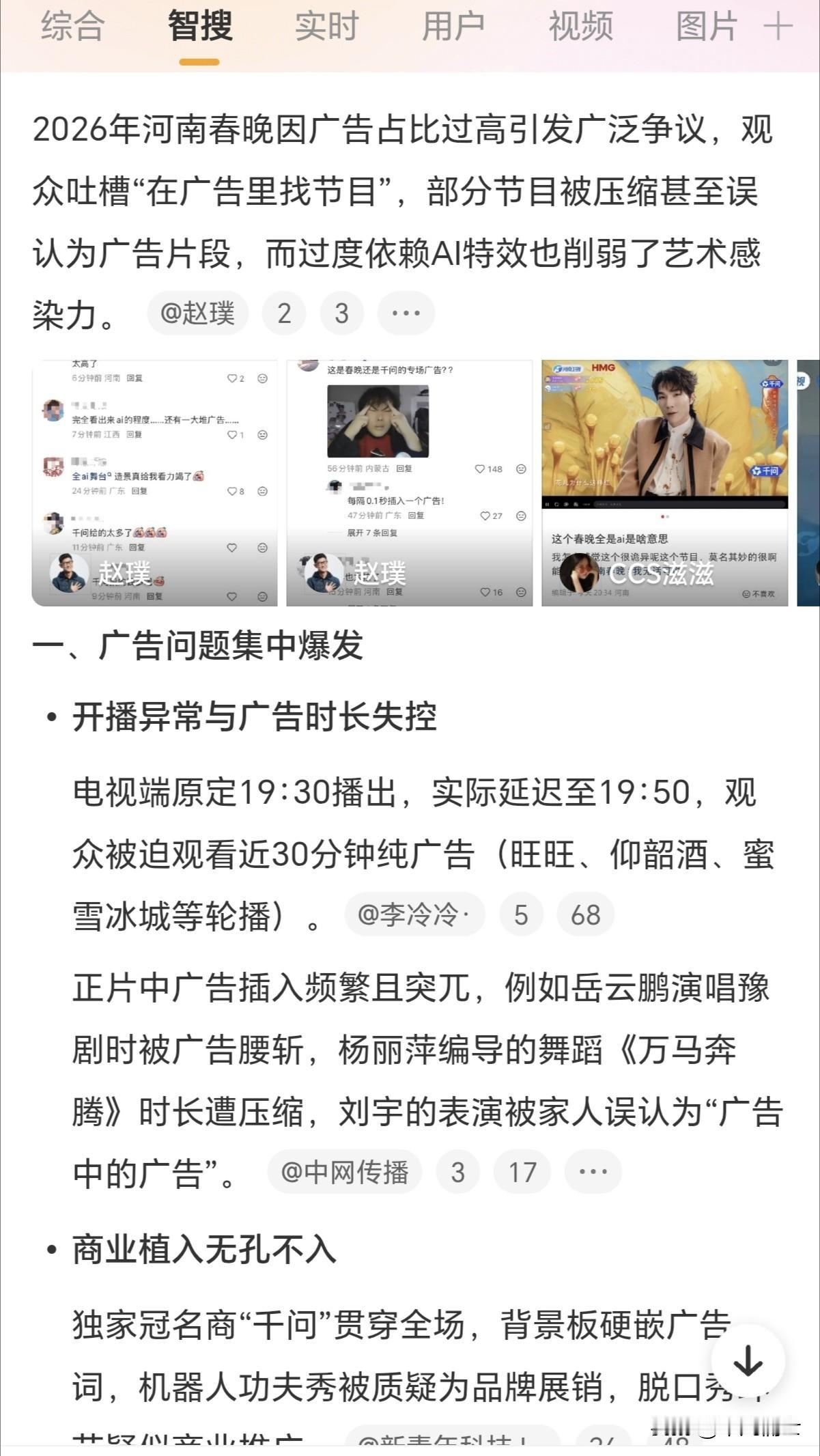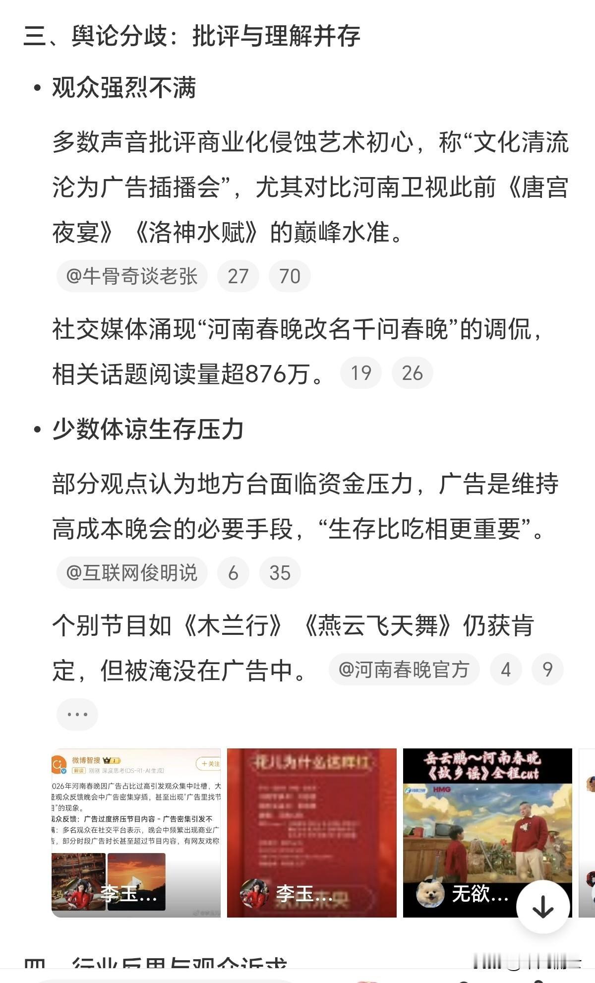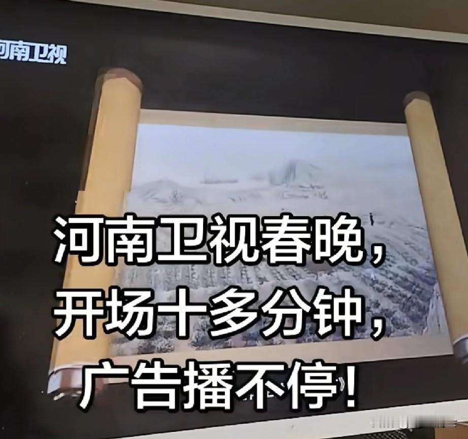 河南春晚又出圈了,这一次不是因为节目质量,而是因为过量的广告中挤占了节目时间而被观众吐槽,草草收场了。 现在的春晚确实不好办,观众审美的不断提升,让举办者绞尽脑汁。以前的历届河南春晚也贡献出了不少优秀节目,让人过目不忘。这一次也是大胆创新,没有了舞台和主持人,也算是一次新的突破值得肯定。要创新就有投入,钱是保障节目质量的硬通货,可是如何平衡收益和节目又成了摆在举办者眼前的难题。可是在直播间观众显然对河南春晚的广告过多已经无法忍受。很有意思的是,在抖音上许多人竟然说,河南春晚的停播是因为节目中有汉服元素被投诉,这是什么样的人才能想出来的理由!看看直播间的评论区,人们就知道是什么原因了。 但是我们还是应该感谢河南电视台在春晚编排上又一次的大胆创新,虽然有时候创新也会遇到一些阻力,但路总是需要先行者,所以,我们应该相信河南春晚永远都是值得期待,这一次不过是前进路上的小插曲而已。经过重新编排的河南春晚一定更加精彩。