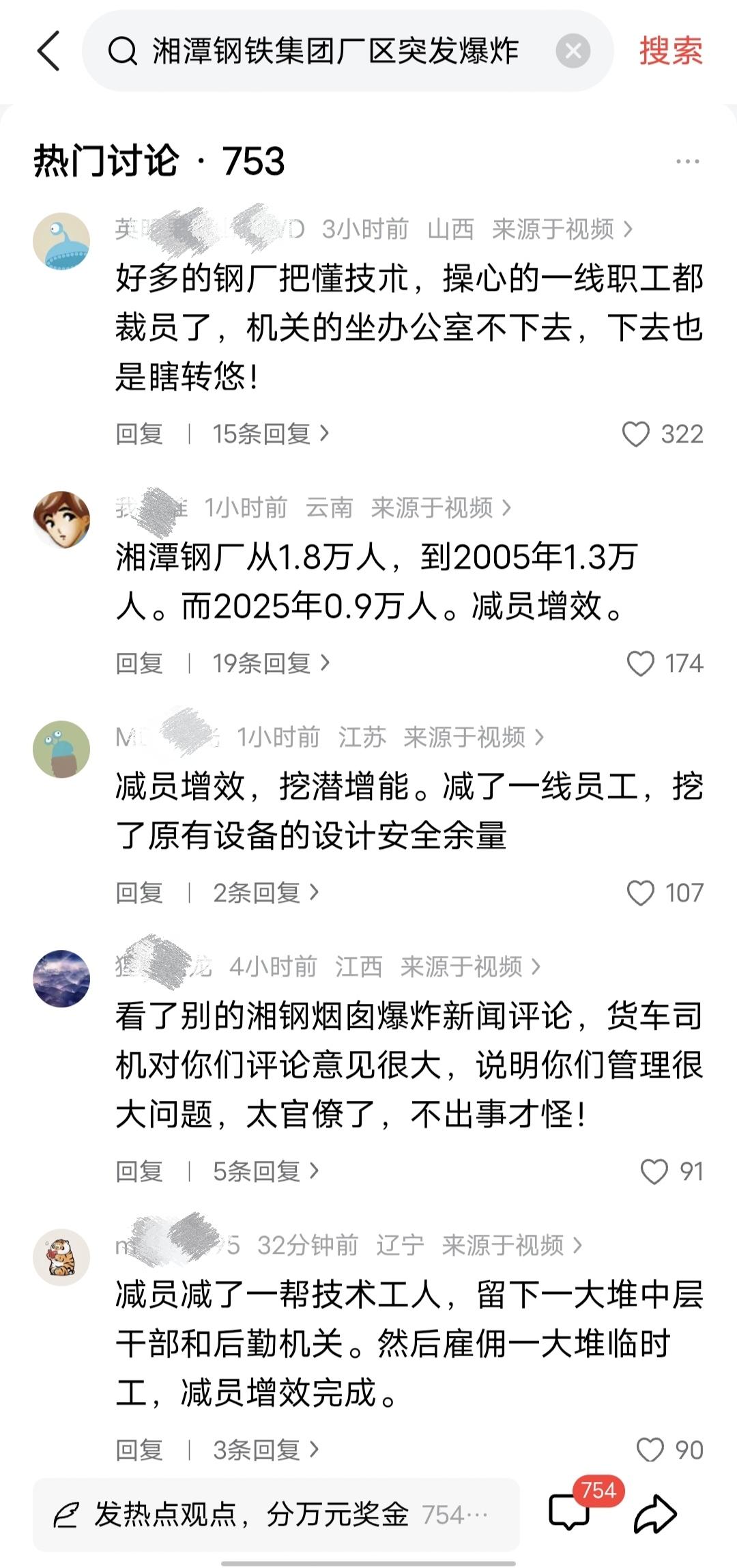两个月两起爆炸事故,钢厂这是怎么了? 上个月18日,包钢一个板材厂发生爆炸,造成了多人伤亡,昨天,湘潭钢铁又发生一起爆炸,前后相隔不到一个月。 翻看视频评论区,许多人都在讨论钢厂减员增效的问题,大意是说一线员工被裁的太多,工作量增大,导致了安全风险的升高。 我不是钢厂职工,也不懂这些。但是我觉得公司领导层确实该来评论区转一转,听听基层员工的呼声,他们在一线工作,对安全生产有着最深的体会。 根据当前新闻看,这次湘潭钢铁发生的事故并未造成人员伤亡,这真是个好消息,毕竟到了年底了,希望所有人都平平安安的,也希望这类事故越来越少,工人兄弟们的收益越来越高。