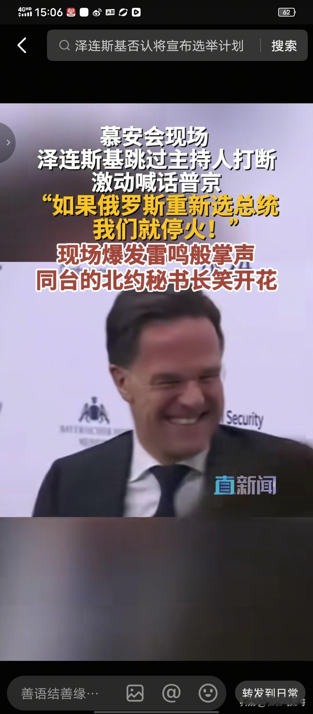 泽连斯基真是一个外交天才,总会在妥协和坚持之间找到平衡点 , 我认为美俄绑在一起都不是他的对手 ! 2026德国慕安会现场, 泽连斯基说到俄乌停火以及选举问题,他抛出这样的言论: 俄乌停火,让特朗普来实现吧 , 他有能力推动普京停火 ,然后我们议会修改法律,进行选举。 泽连斯基很高明, 美国既然偏向俄罗斯,想乌克兰进行选举,那就先去说服俄罗斯停火。 乌克兰进行选举总不能在俄罗斯的炮火下进行吧。 俄罗斯会为了让乌克兰进行选举同意停火吗? 显然不会。 乌克兰选举最低需要三个月,让俄罗斯停火三个月,让乌克兰利用选举去充血,获得喘息的机会 ,俄罗斯没有这么傻 ! 可以说泽林斯基这番言论堵住了美国想乌克兰选举的嘴 ,不是乌克兰现在不愿进行大选,是你美国没办法让俄罗斯先停火! 这还不算高招,最高的是泽连斯基话赶话后面的举一反三。 当时主持人准备提问北约秘书长,泽连斯基却打断主持人, 说 如果俄罗斯境内进行新的选举,乌克兰愿意为他们提供停火! 话音刚落,全场掌声雷动。 北约秘书长吕特更是为泽连斯基最精彩的“提议”笑开了花 。 看看,泽连斯基厉害吧 ,我乌克兰进行选举,你俄罗斯不敢停火,但是你俄罗斯选举,我乌克兰就敢先停火! 虽然是嘴炮 ,但是这嘴炮充满了智慧!