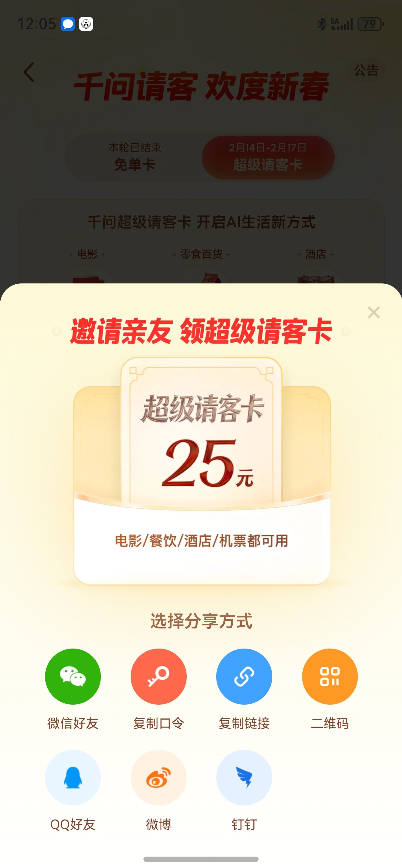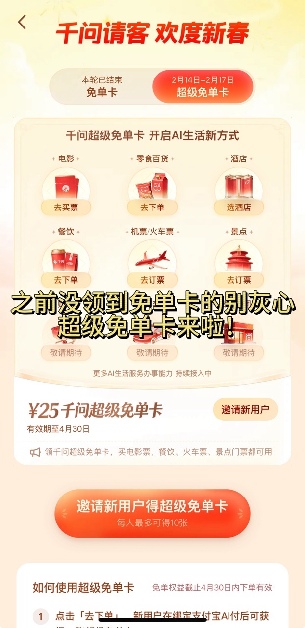 千问再次激活群聊 这次更简单粗暴了,我刚直接把口令给我妹,复制粘贴打开千问领取,3秒完事,我跟我妹一人一个25的超级请客卡,电影票、吃饭、火车票、零食百货,几乎涵盖了所有的春节活动,我还能送9个,现在马上,私信我!!