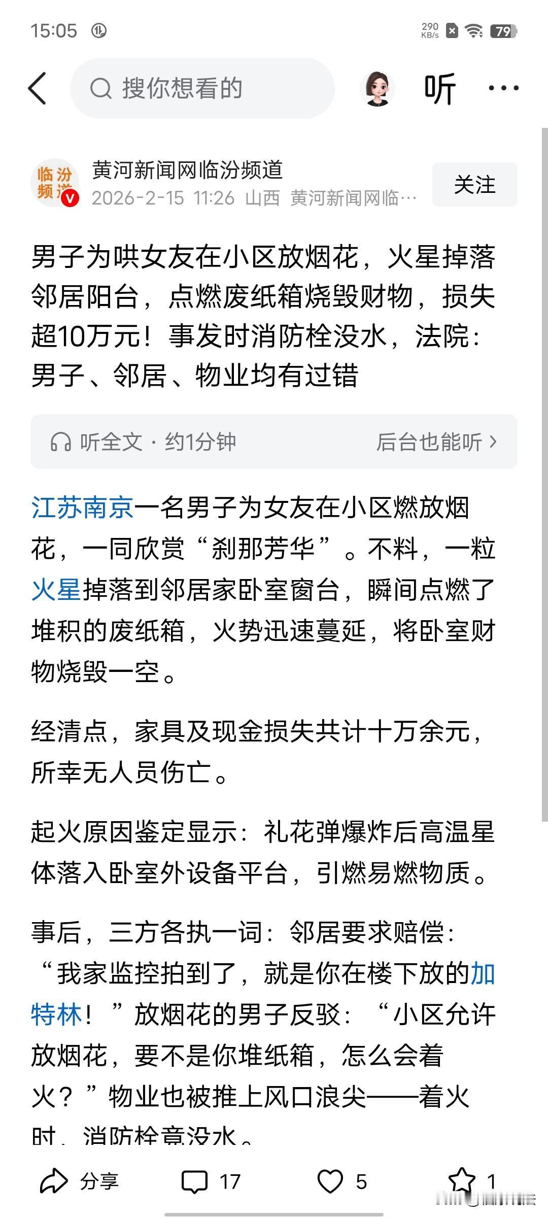 江苏南京,男子为哄女友开心,在小区放烟花,谁料,火星落在邻居窗台,点燃上面的废纸箱,卧室被烧毁,损失10万多,邻居指责男子,监控拍到他在楼下放加特林。男子不服气:要不是你堆纸箱,怎么会着火?可事发当时,消防栓里没有水,物业也被牵扯进去,三方争论不休闹上法院,法院这样判了。 男子为了哄女友开心,那可真是煞费苦心、绞尽脑汁,结果还是闯了大祸。 当时,小区里静谧祥和,男子为了营造浪漫氛围,把带着买好的烟花放在小区楼下选好的一块空地上,然后拿打火机将烟花点燃。 只听“嗖——啪”几声,烟花如流星般冲向夜空,瞬间绽放出五彩斑斓的光芒,照亮了小区的一角。 女友兴奋得像个孩子,又蹦又跳,还紧紧抱住男子,男子看着女友那灿烂的笑容,心里比吃了蜜还甜,觉得自己这番心思总算没白费。 可谁能想到,这看似浪漫美好的一幕,却暗藏着巨大的危机。 谁也没想到,一颗微弱的火星,从天空中滑落下来,不知不觉的地掉落到邻居家卧室的窗台上。 而这家邻居平时可能是个会过日子的主儿,在空调平台上,堆了一大堆废纸箱。 这些纸箱就像一堆干柴,本就易燃,遇到火星后,不一会儿就燃起了小火苗。 火苗越烧越旺,如燎原之势般迅速蔓延开来,眨眼间就将卧室里的财物烧得面目全非、化为灰烬。 当邻居发现那一刻吓得脸色煞白、魂飞魄散,一边声嘶力竭地大喊“着火啦,救命啊”,一边手忙脚乱地拨打119。 等消防员风驰电掣般赶来的时候,卧室里的家具已经被烧得七零八落、惨不忍睹,现金也变成了一堆黑乎乎的灰烬。 经过仔细清点,家具及现金损失共计10万余元,还好没有人受伤,也算是不幸中的万幸啊。 事后,邻居气得暴跳如雷,指着男子的鼻子说:“我家监控拍得清清楚楚、明明白白,就是你拿着加特林在楼下放,你必须得赔我损失,这10多万块可不是小数啊!” 放烟花的男子却振振有词、理直气壮地反驳:“小区又没明文规定不允许放烟花,再说了,要不是你在空调平台堆那么多废纸箱,怎么会着火呢?这能怪我吗?” 男子和邻居争论不休还没有个结果,这边物业也被推上了风口浪尖,成了众矢之的。 因为,着火的时候,消防栓里居然没水。 问题来了,物业平时是怎么管理的?消防栓没水,这要是有更严重的火灾,那后果简直不堪设想,物业也有一定的责任。 为此,三方因为这件事吵着上了法院,就为了一个公正说法。 那么,法院会怎么判定呢? 法院认为:三方都有错! 《民法典》第1165条规定:行为人因过错侵害他人民事权益造成损害的,应当承担侵权责任。 第一,男子在小区燃放烟花,位置离居民楼过近,没充分考虑到可能引发的危险,未尽到安全注意义务。他的行为存在过错,对邻居财物受损需承担侵权责任,得为自己的疏忽买单。 第二,邻居在空调平台堆放易燃的废纸箱,这无疑是在自家埋下了一颗“定时炸弹”。 当男子燃放烟花迸发火星时,纸箱就成了火灾的“帮凶”。 邻居没处理好自家物品,对火灾形成存在过错,也得为自己的行为承担相应后果。 第三,物业有保障小区安全的职责,应该规定烟花的燃放具体区域,可他们让居民随意燃放烟花,增加了安全隐患。 而且,发生火灾时,消防栓没水,存在过错。 消防设施失效,属于安全管理严重失职,因为,物业的过错导致损失扩大,必须承担责任。 最终,法院判决:男子、邻居、物业三方按照过错程度分担损失。 其实,男子想哄女友开心本是好事,但选错了方式,没考虑安全因素,给别人造成损失就得承担责任。 邻居堆纸箱虽可能是为了卖点零花钱或者方便使用,但不能忽视安全,一个是易燃物,一个是高空很可能掉下来,都存在危险。 物业收了物业费,就该做好安全保障。三方都有错,按过错分担损失很合理。 这也提醒大家,做事得考虑周全,放烟花虽然美丽,但别只图一时之快,一定要注意安全。 所以,大家放烟花之前一定要观察一下周围环境,远离易燃物,千万注意安全哦!
