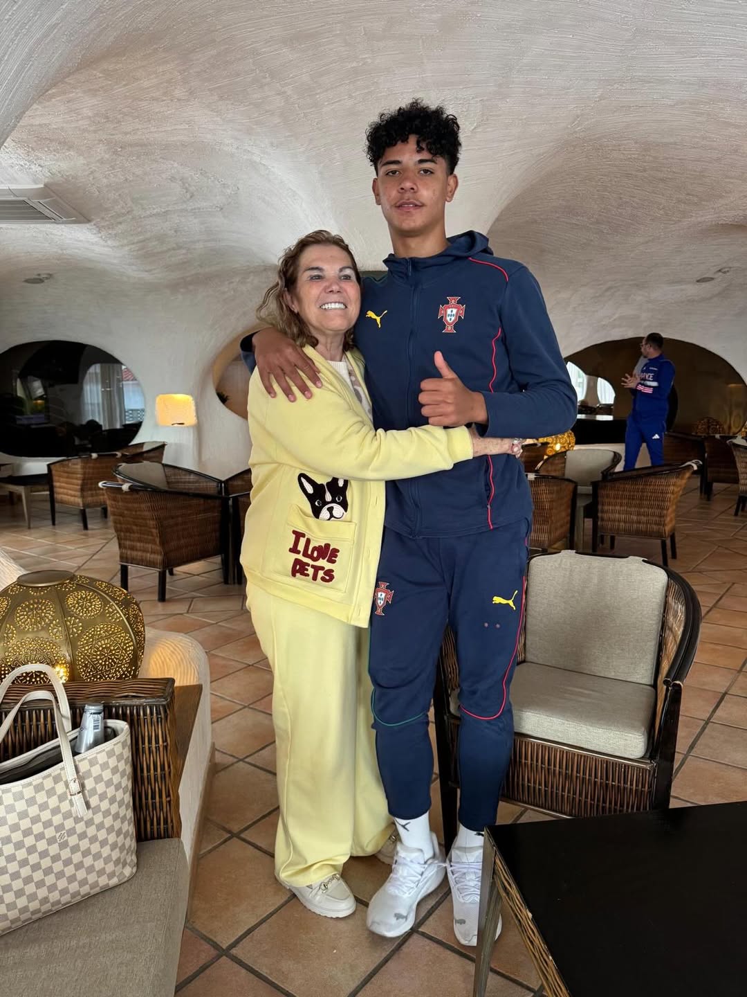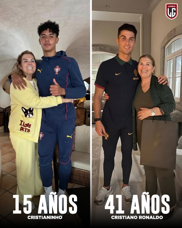 有球迷用C罗与妈妈的合照作对比,可以看出,迷你罗已经和父亲C罗一般高。