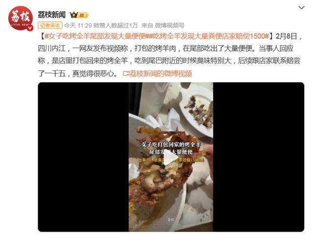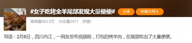 2月12日,据荔枝新闻报道,四川内江一女子将在餐厅吃剩的烤全羊打包回家,结果在羊尾部位发现大量粪便。
