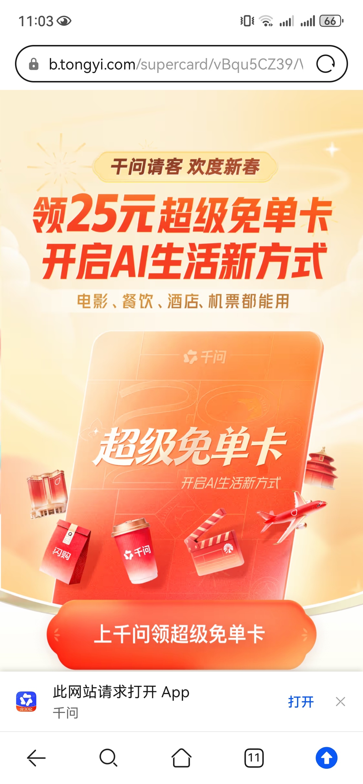 千问让我实现了景区门票自由红包超级免单卡,可以打车,看电影,买门票,交话费,买东
