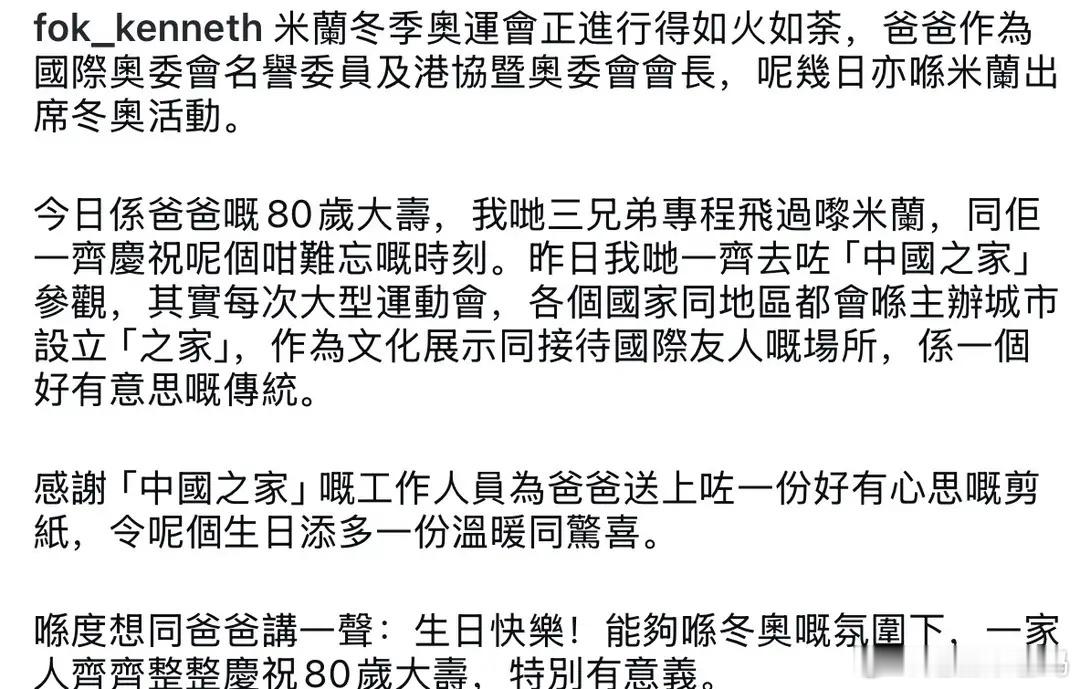 霍启刚家三兄弟齐飞米兰,特意为父亲霍震霆庆祝80岁大寿,父子同框画面温馨又幸福!