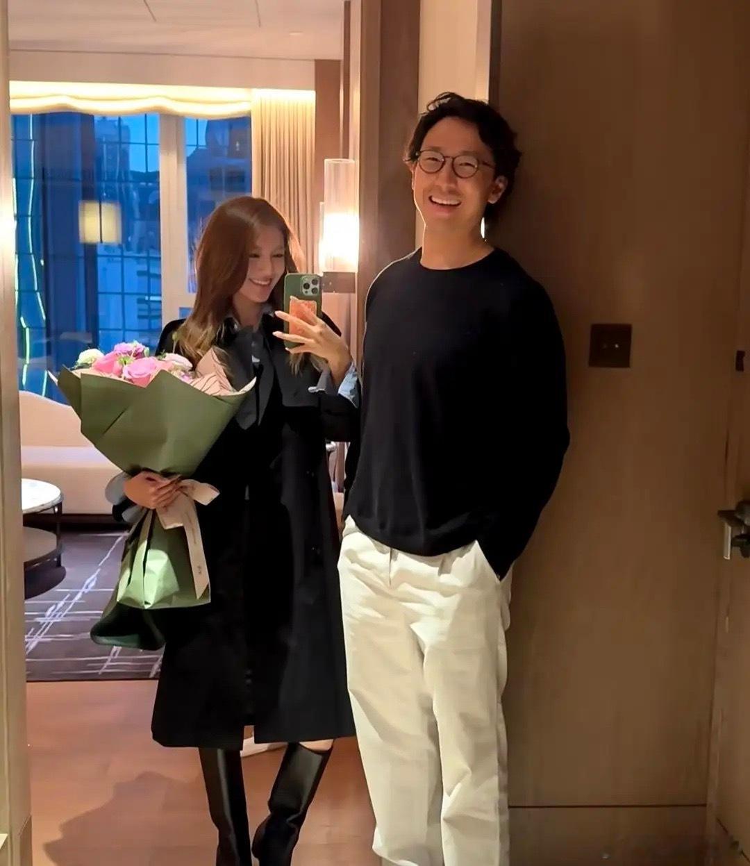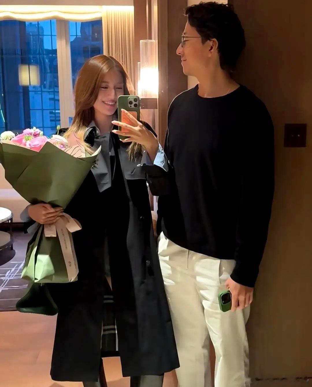 吴千语晒节日照,怀里抱着鲜花和老公合影,两人用情侣手机壳好甜,施伯雄看着她笑得一