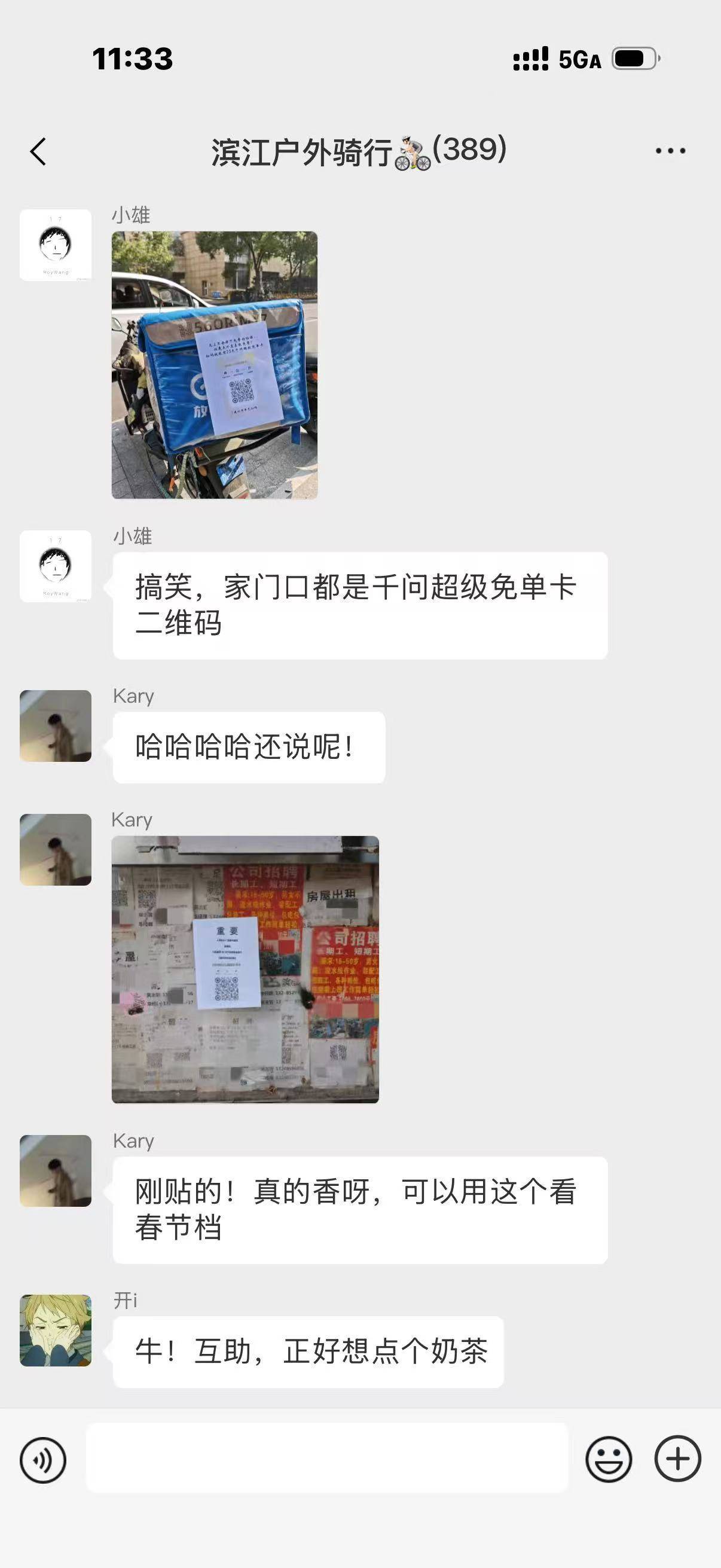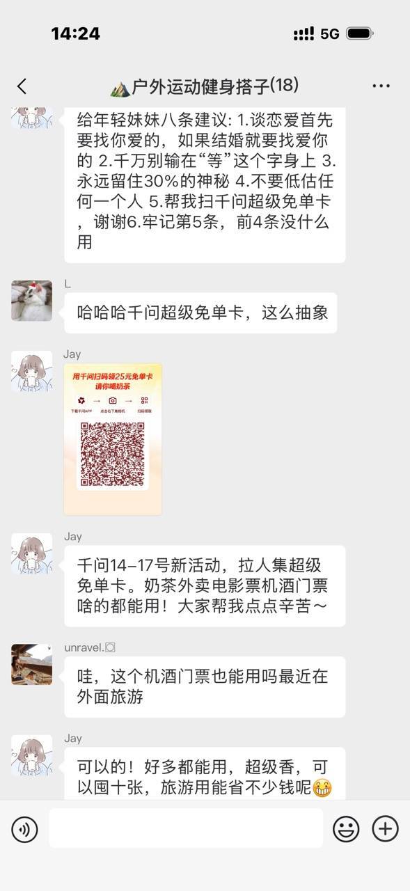 千问再次激活群聊 千问我将永远守护你。。当别的平台还在几毛几分的发红包,千问直接发免单卡了,机酒门票、奶茶外卖电影票都能用,怪不得列表群聊全是转发的,我也要继续拉人!