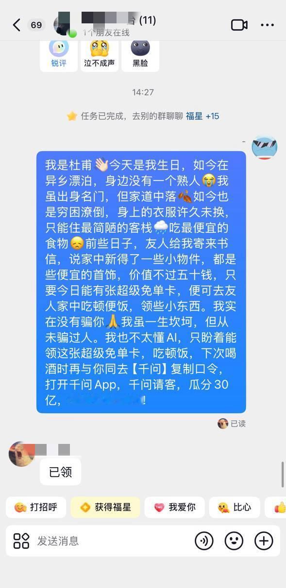 千问再次激活群聊 千问我将永远守护你。。当别的平台还在几毛几分的发红包,千问直接