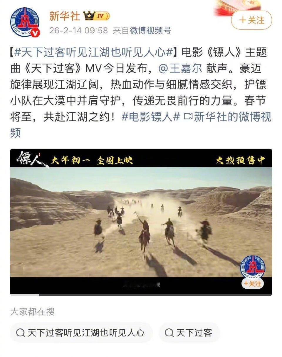 王嘉尔镖人主题曲有效宣传真·王嘉尔一响,江湖登场!《镖人》主题曲《天下过客》上线即登顶热度,官媒认证、乐评推荐,热血质感直接拉满!电影还没上,歌先火出圈了!!