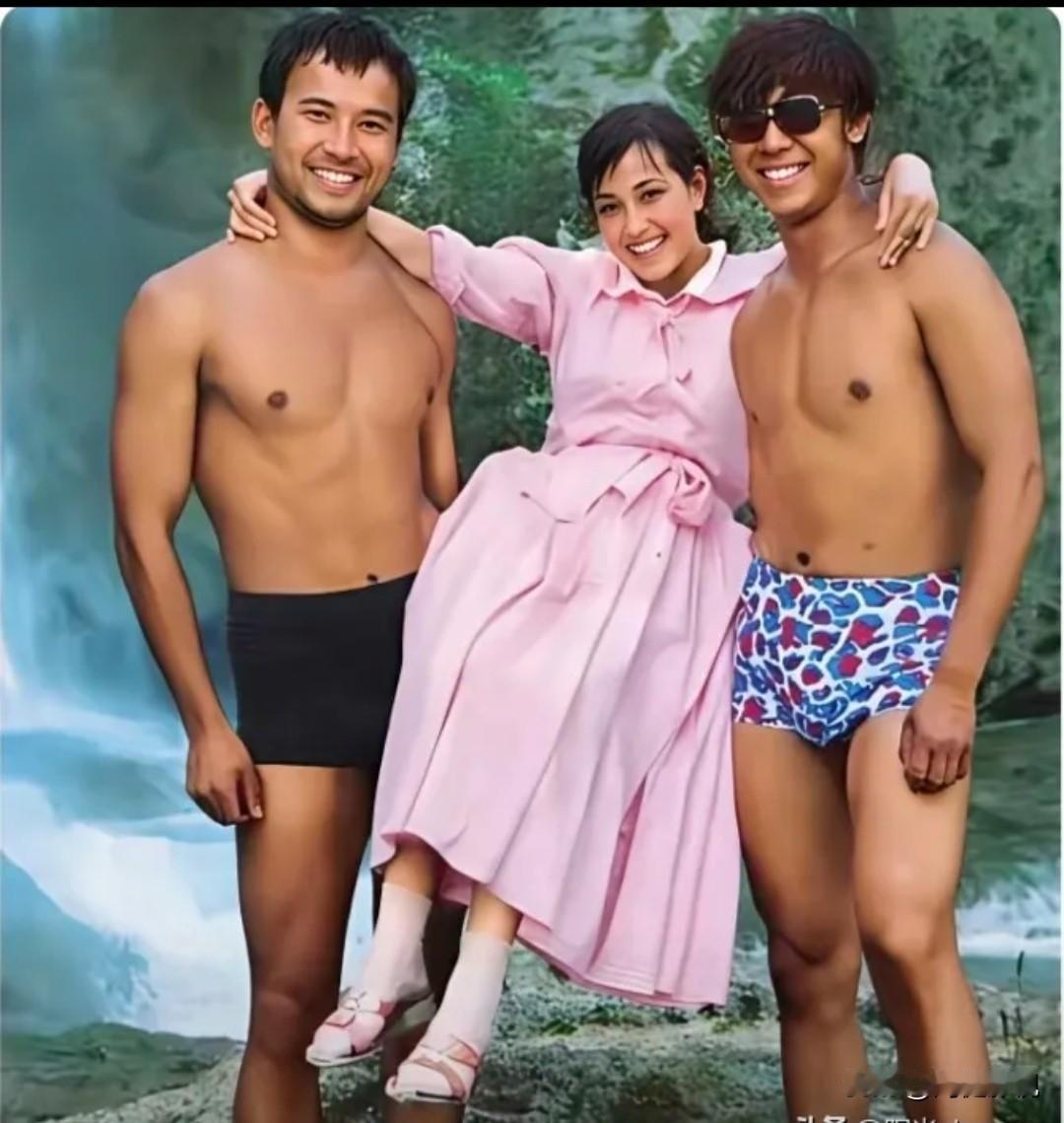 仔细看,那时的刘晓庆细眉飞扬,秀韵多姿!穿粉裙子被两个健壮小伙笑着托着,看她笑得比谁都开心,像被宠成了小公主。看右边穿花泳裤戴墨镜的是姜文吧?而左边健壮小伙是谁?看他疏眉朗目,英姿昂昂!看起来比姜文还猛壮,他也是演员吗?有谁认识他?