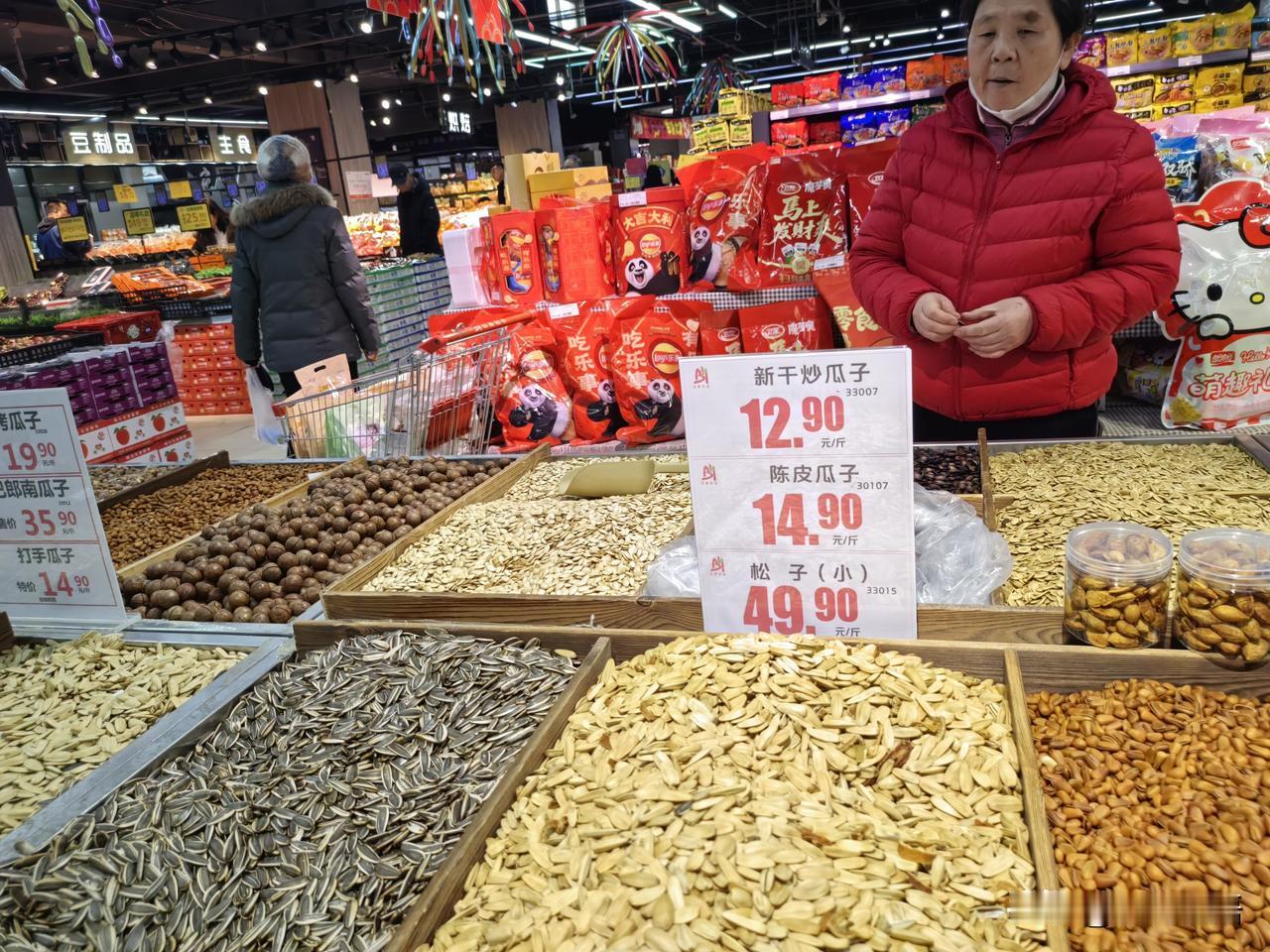 今天是腊月二十八,老公也放假了,准备开启过年模式了。 过年的猪肉牛肉鱼呀虾呀都有了,还缺一些蔬菜和调料,我俩打算去超市采购年货去。 每年过年的时候,大润发的人都特别多,今年也不例外。 快到过年了,以为蔬菜价格会很贵,到了超市,一看还真不贵,和平时差不多。 鸡蛋3.69元一斤,大葱3.48元,小葱6.18元,生菜9.98元,瓜子12.9元,花生8.5元,松子49.9元。 我和老公买了一些蔬菜和调料,两大兜子才花了121元。 红袜子每年都要买一双的,三口人一人一双,三双花了29元。 每年我们家都会买踩小人的红袜子,图个吉利,祈福新的一年和谐顺畅,吉祥如意,远离小人。 朋友们,过年了,你们都开始采购年货了吗?踩小人的袜子你们都买了吗?