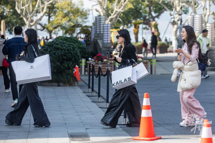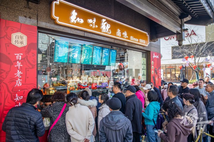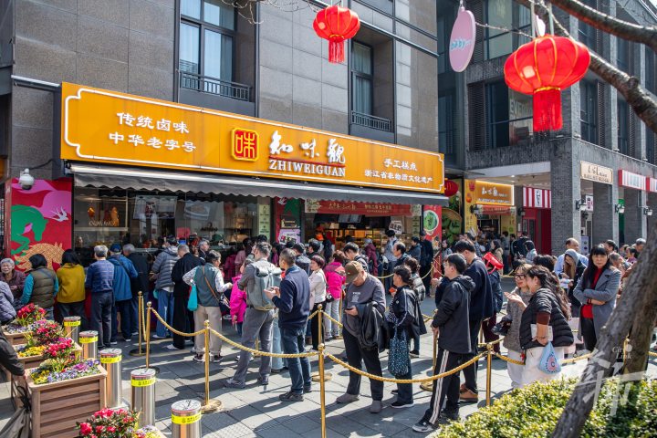 湖滨步行街附近的知味观总店,外卖窗口前也是长长的队伍,市民和游客正在争相购买杭州特色的糕点和卤味。