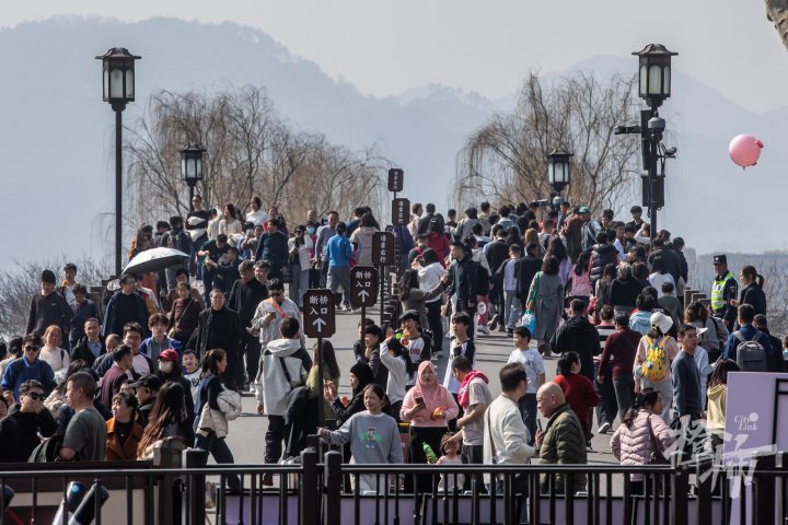 断桥上,游人如织,桥面中央设置了隔离护栏,游客通行井然有序。
