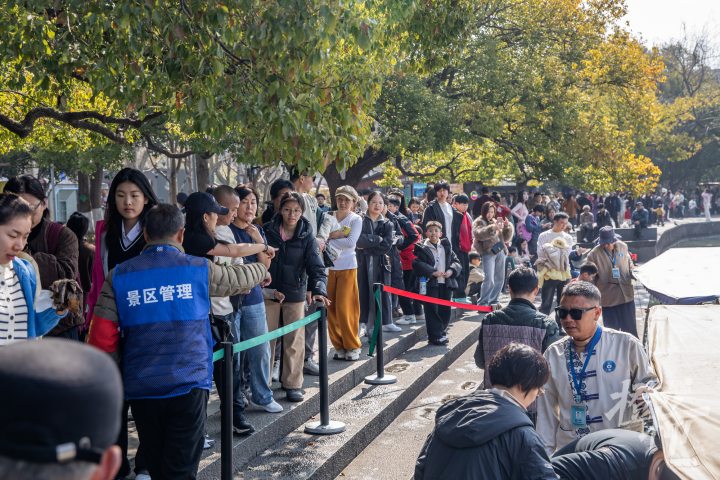 西湖上,舟楫繁忙,岸边码头,游客排起长队,等待坐船游览西湖。