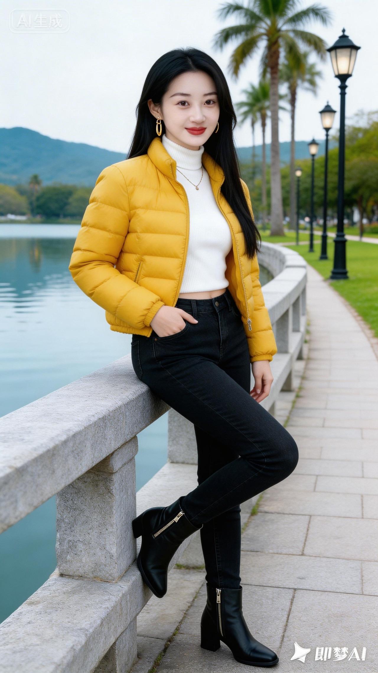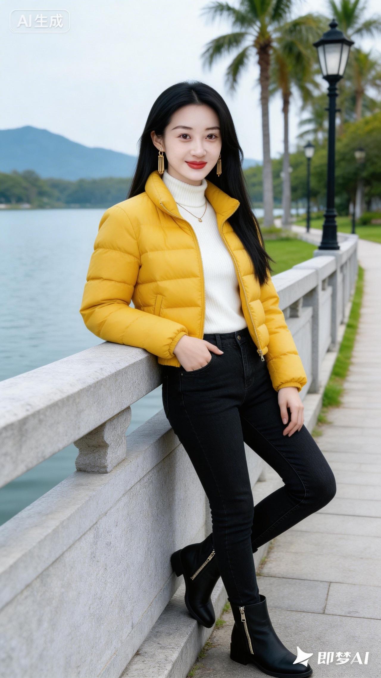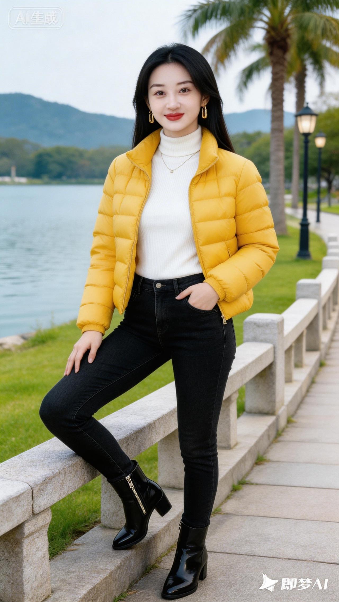 冬日穿搭指南:黄色羽绒服+黑色牛仔裤,温暖又时尚!🌞👗👖👢
