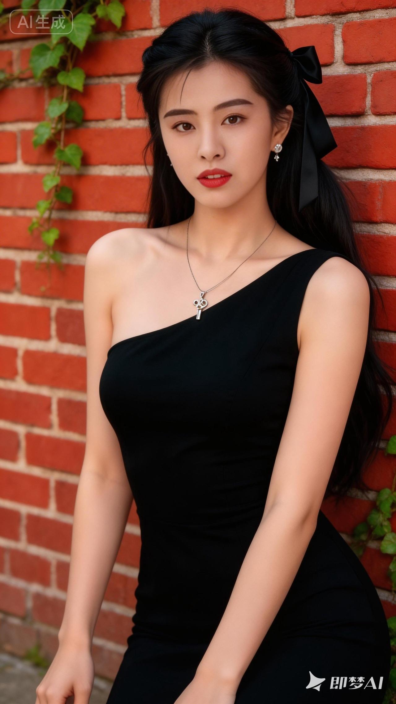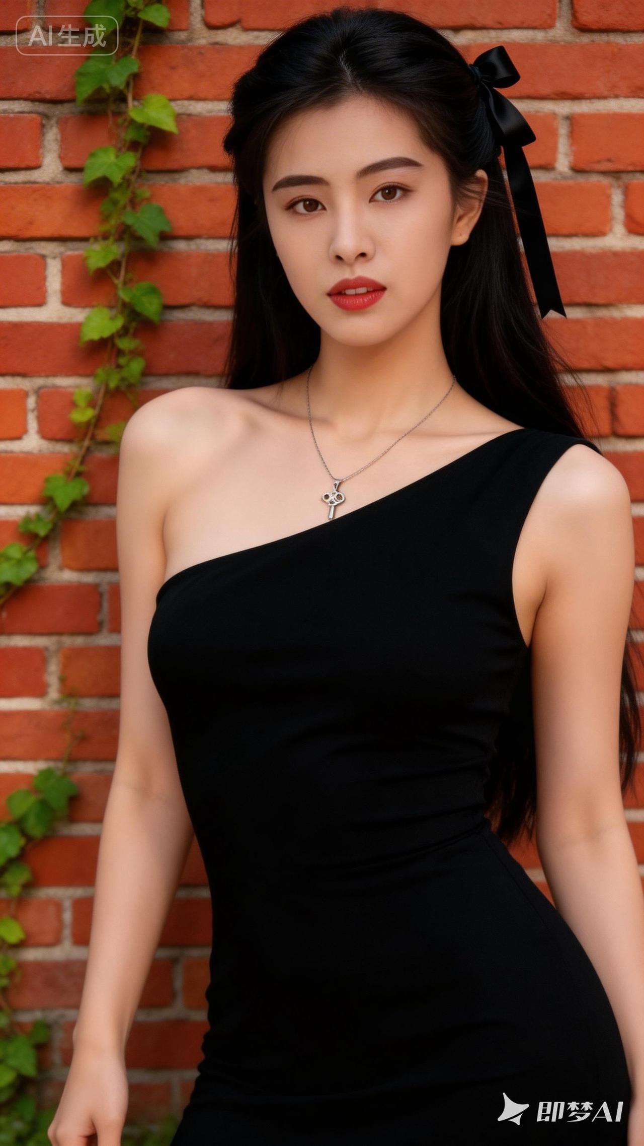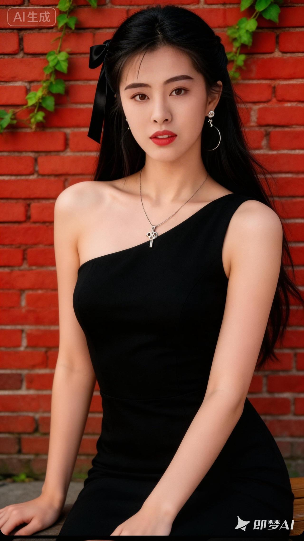 优雅黑裙,红砖背景,自然妆容,清新自然。