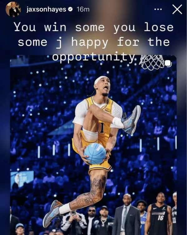 母鸡被惊吓后都会比海斯跳的高?这就太尴尬了! 本届NBA全明星扣篮大赛,海斯曾在全明星之前有过一次扣篮,他的表现让东契奇都张大的嘴。 湖人客场对战奇才的比赛首节,海斯连续接到东契奇妙传,随后自己战斧砸扣连拿8分。 不过全明星扣篮大赛的首轮比赛中,他的滑翔劈扣却遭到了自家自媒体的吐槽。 LakeShowYo晒出海斯的扣篮画面,并写道:“我的天啊,扣篮大赛彻底完蛋了,贾克森·海斯,你刚才那是什么鬼?” 不过海斯倒是没有对这个场面有太多的尴尬,他的比赛前曾经表示自己最想参加的就是扣篮大赛,比赛结束后他在个人Instagram上发文写道:有赢有输。很开心能得到这次机会!