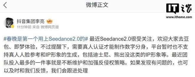 IT之家2月15日消息,今日,抖音集团副总裁李亮在社交平台发文称,“最近Seedance2.0很受关注,欢迎大家去豆包、即梦体验,不过提醒下,需要真人认证才能制作数字分身,平台暂时也不支持真人人脸参考和IP形象的生成,包括迪士尼、熊出没这类的IP形象等。最近团队投入最多的一件事就是不断维护和加强反侵权策略。如果发现有问题的,也可以及时和我们反馈,我们会跟进处理收起。”